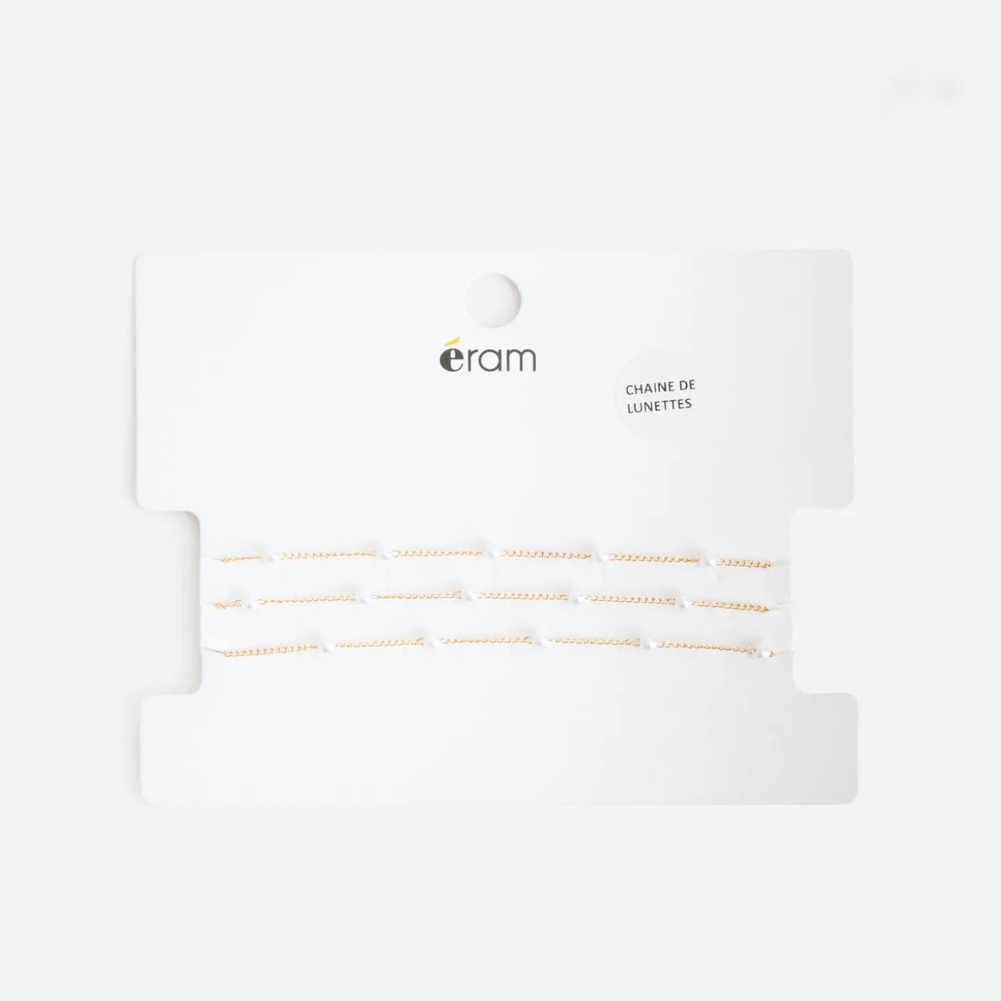 Les lunettes sont plus qu’un simple accessoire de mode. Pour ne plus les perdre, pensez à la chaîne à lunettes comme un bijou chic. Montée sur du métal doré, elle est décorée de petites perles nacrées et finalisée par des boucles antidérapantes en caoutchouc avec butée pour une fixation sûre.