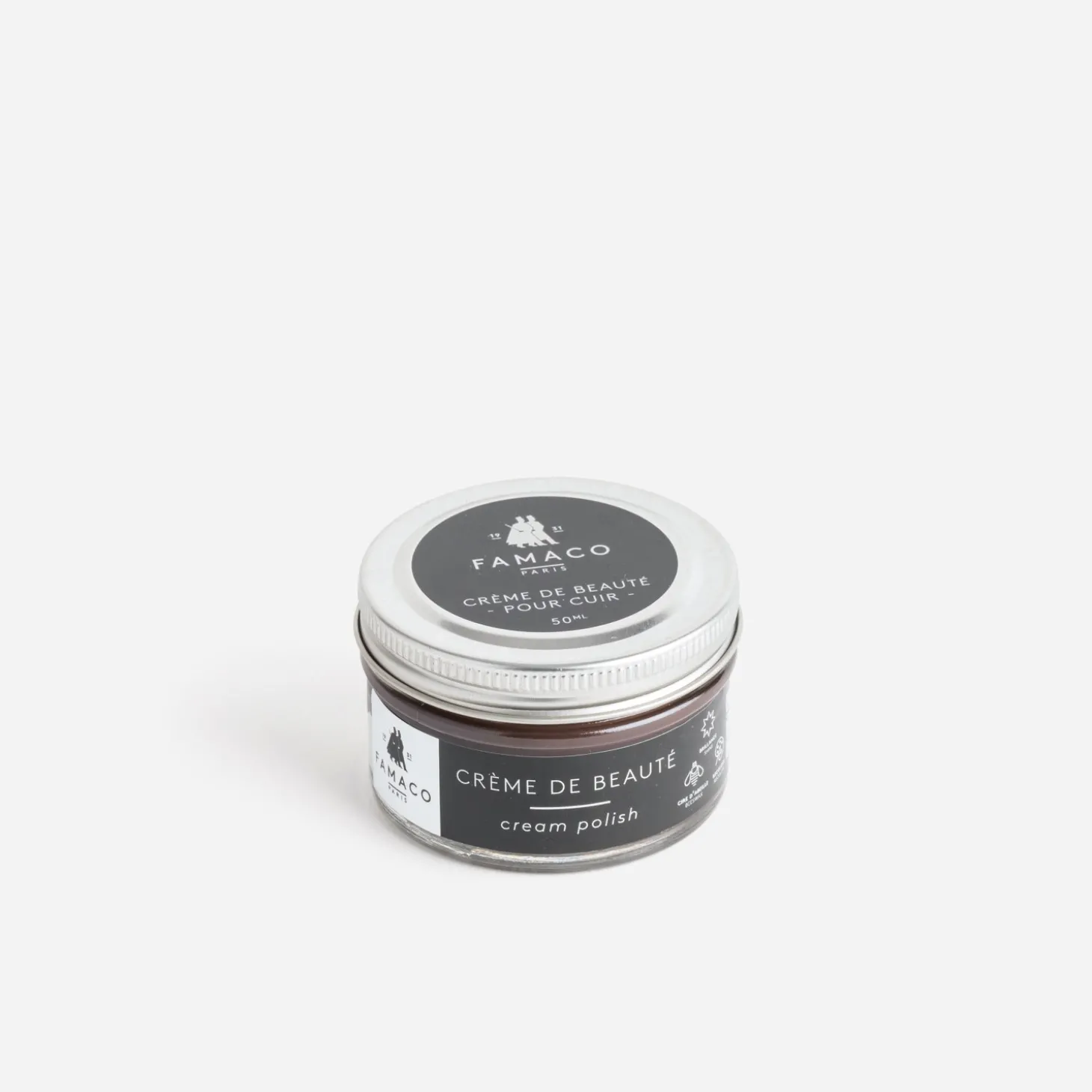 La crème de cirage porte bien son nom : crème de beauté. Ses promesses : nourrir le cuir, raviver les couleurs, faire briller. Après avoir dépoussiéré la chaussure avec une brosse, étalez la crème sur le cuir avec une chamoisine. Laissez sécher puis lustrez avec un chiffon doux. Renouvelez l’opération régulièrement. Un entretien indispensable, pour prolonger la durée de vie de vos chaussures. Ce produit est conçu spécifiquement pour les souliers et accessoires en cuir de couleur marron.