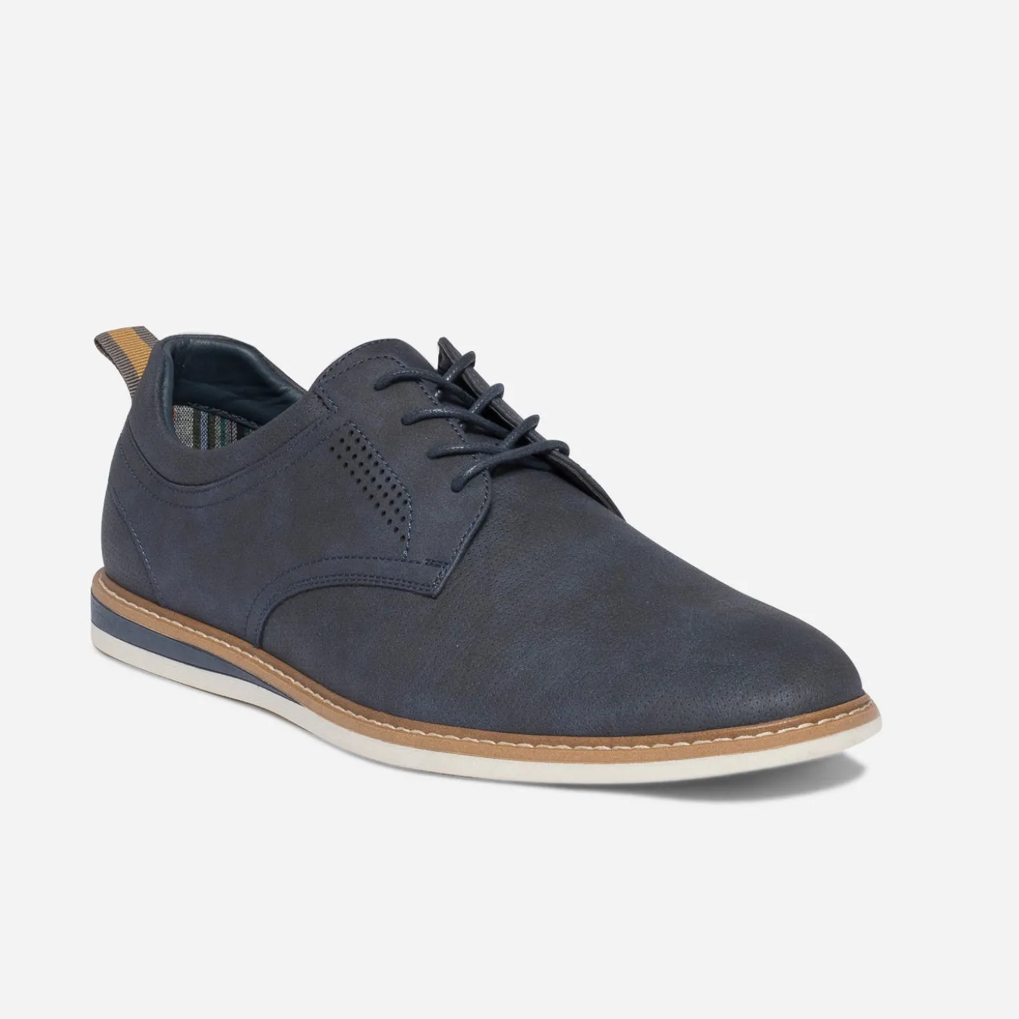 Sur le dessus, du cuir perforé. Dessous, une semelle légèrement compensée. Ce derby homme se décline en coloris bleu marine, sobre et intemporel, qu’importe la saison. Ses atouts style : une doublure en textile à rayures et un galon bicolore sur le contrefort. Un modèle pour apporter, aux looks, une touche décontractée.