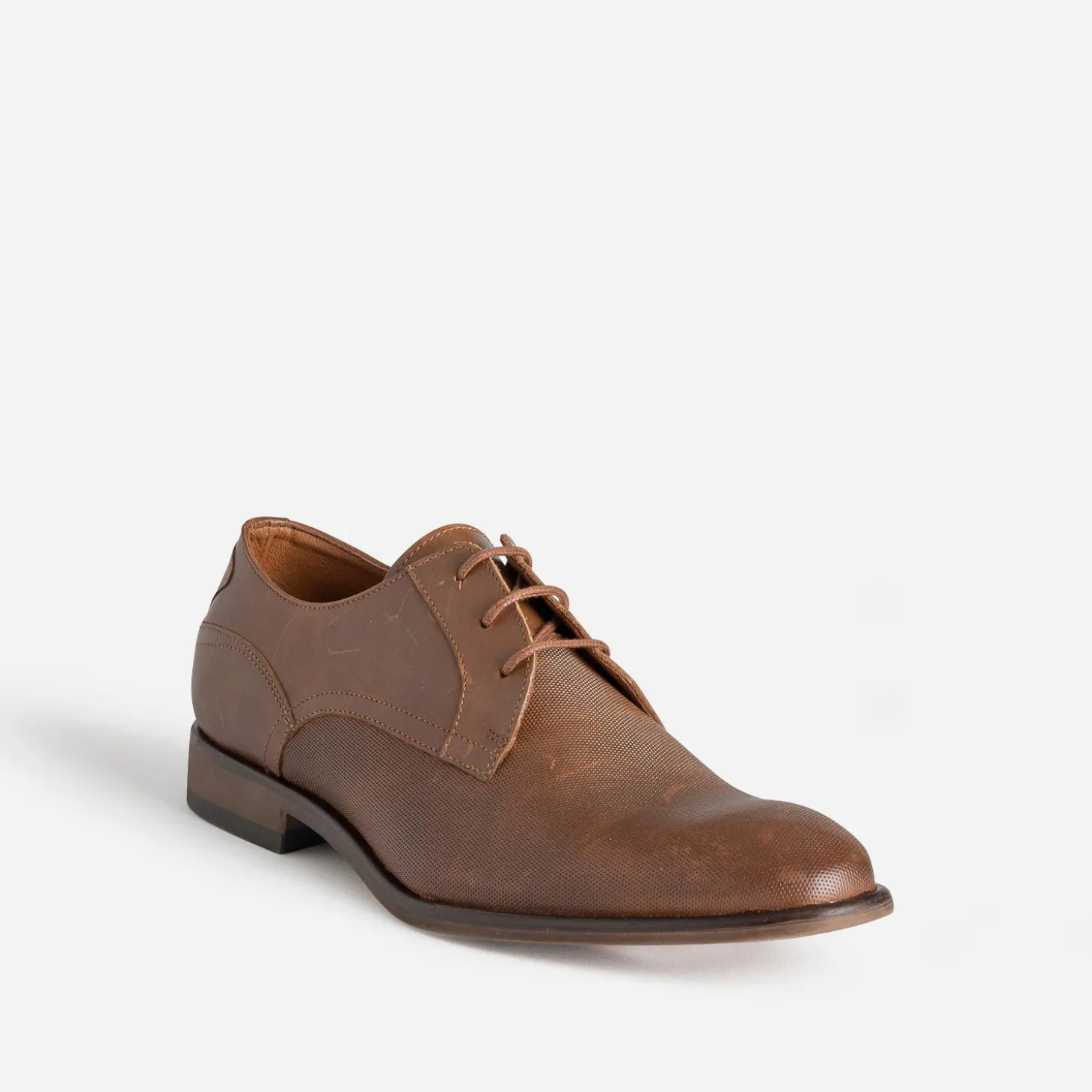 Le derby confirme son statut de soulier masculin, réservé aux tenues formelles. Confectionné en cuir, décliné en coloris cognac, il se démarque par un effet embossé sur tout le dessus du pied, en contraste avec les quartiers, plus lisses. Il se ferme par un lacet rond, ton sur ton. Un modèle de référence, pour vos costumes bleu marine ou gris anthracite.
