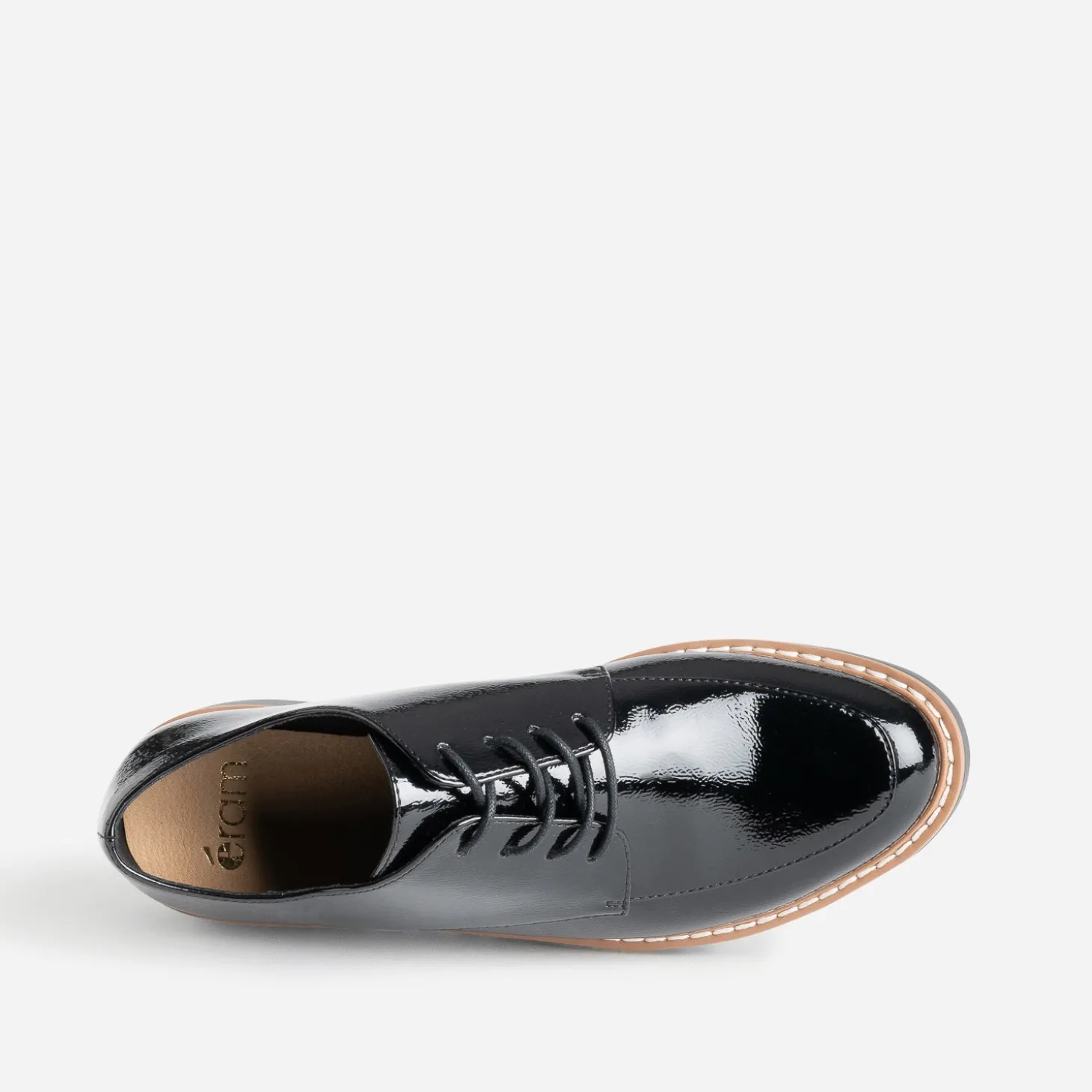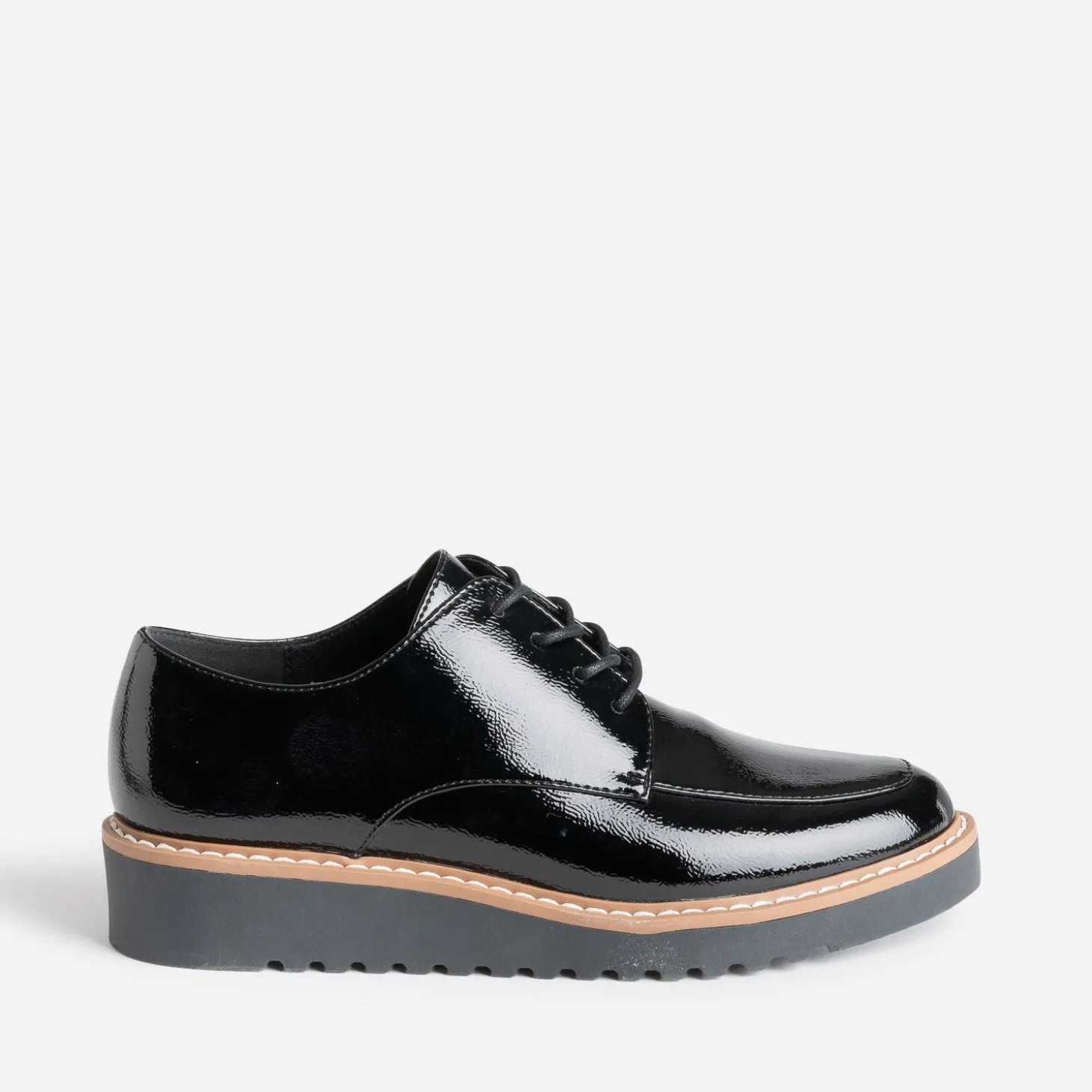 Place au confort, avec ce derby pour femme. Son atout ? Une semelle légèrement compensée. En matière synthétique lisse, il se décline en coloris noir et finition vernie, avec trépointe cousue contrastée. Un modèle à décaler avec un pull à col Claudine et un pantalon à carreaux ou une jupe courte avec des chaussettes hautes.