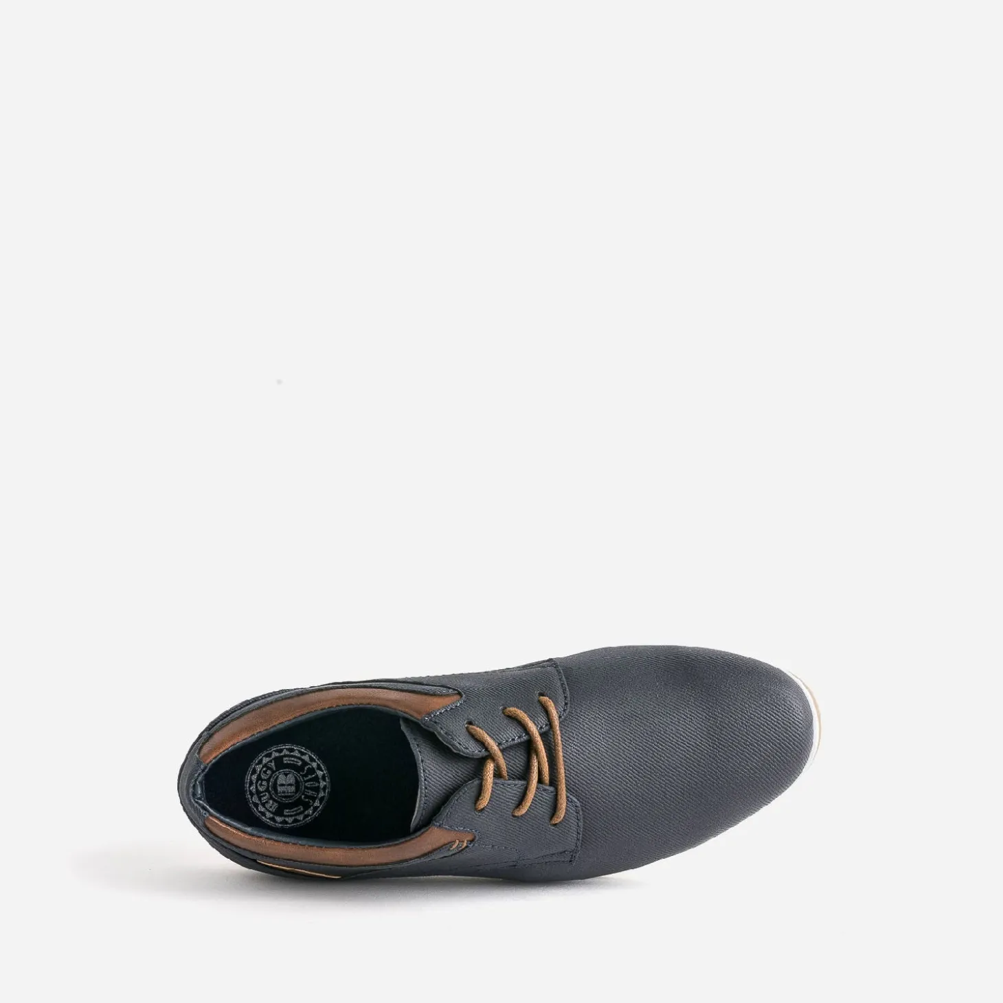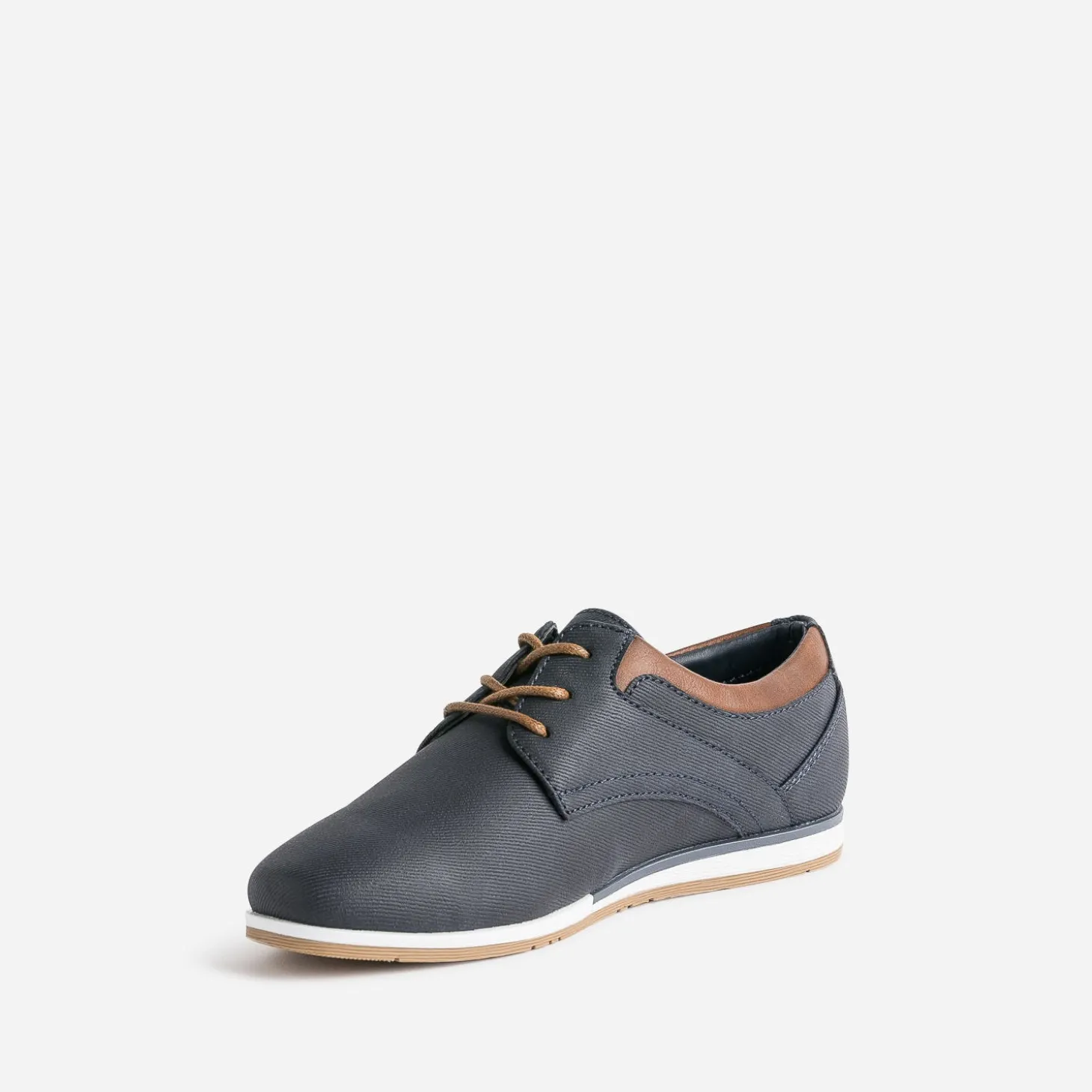 Matière synthétique rainurée, doublure textile chinée, détails marron, ce derby pour garçon s’invite dans le dressing d’été. Il séduit par une semelle tricolore légèrement compensée, pour plus de confort, et un style plus décontracté.