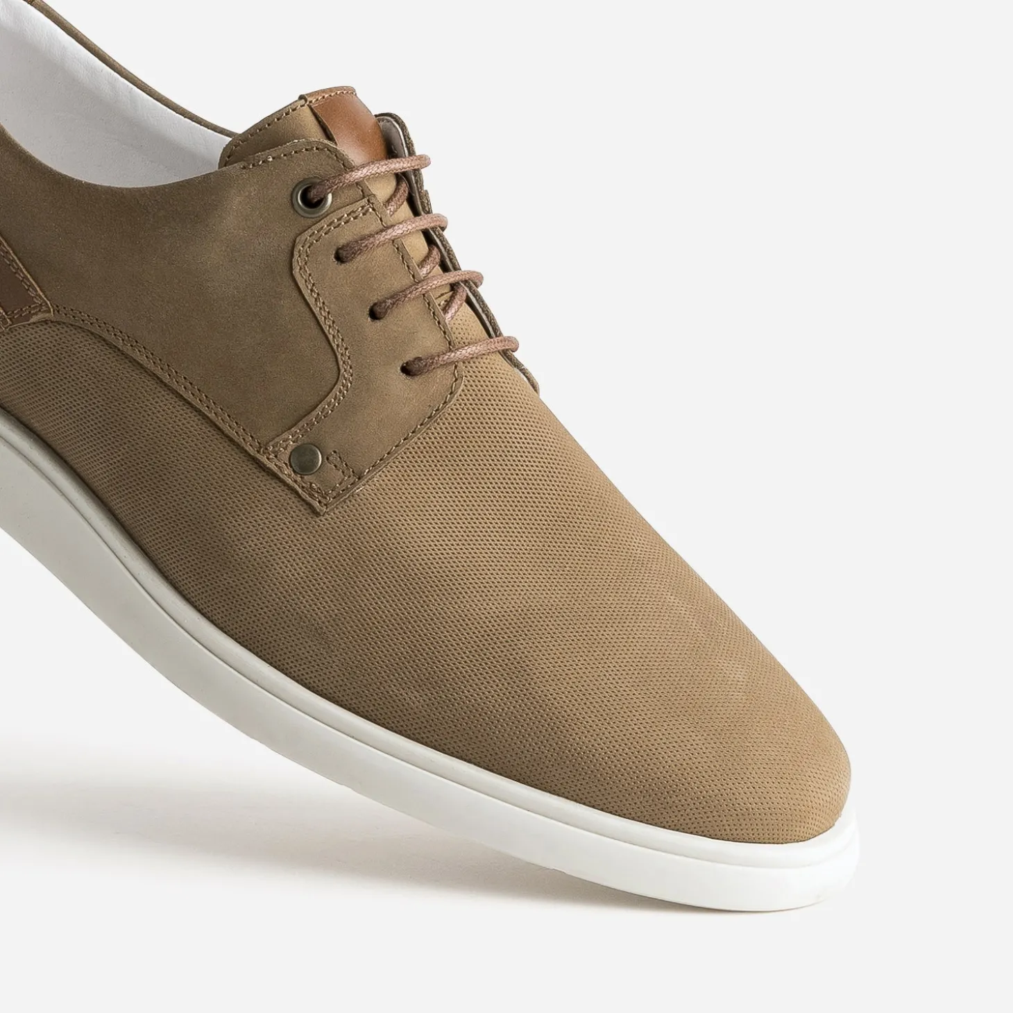 Le derby est un des rares modèles de souliers à modifier son style, en fonction du look recherché. Monté sur une semelle contrastée, il adopte un style sport, plus décontracté. Confectionné en cuir nubuck camel, il associe quartiers lisses et dessus à embossage discret. Réservez-le avec une chemise en jean bleu et un pantalon chino camel.