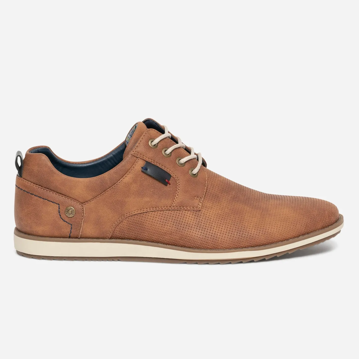 Entièrement en matière synthétique et textile, ce derby est idéal en été. Cognac, il joue avec les matières et les détails pour se faire remarquer : perforations sur le dessus du pied, effet jean brut au col, surpiqûres sur le contrefort et doublure imprimée rayures. Monté sur une semelle légèrement compensée, il est parfaitement adapté au quotidien.
