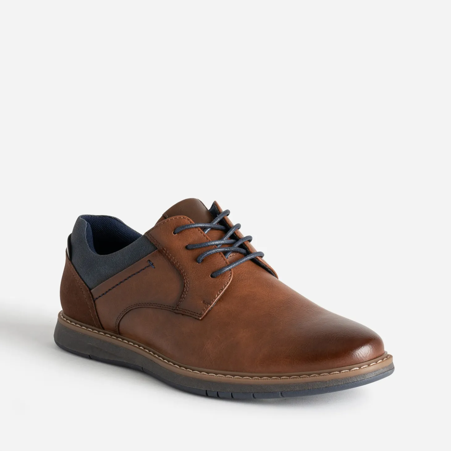 Cognac, c’est sa couleur dominante. Bleu marine, ce sont les détails. Marron, c’est la touche en plus. Ce derby homme mise sur le style, dans une harmonie couleurs de saison, et le confort, grâce à une semelle sans décroché. Un modèle que vous pourriez porter tous les jours, avec une chemise et un pantalon chino, avec un pull à col rond et un jean brut.