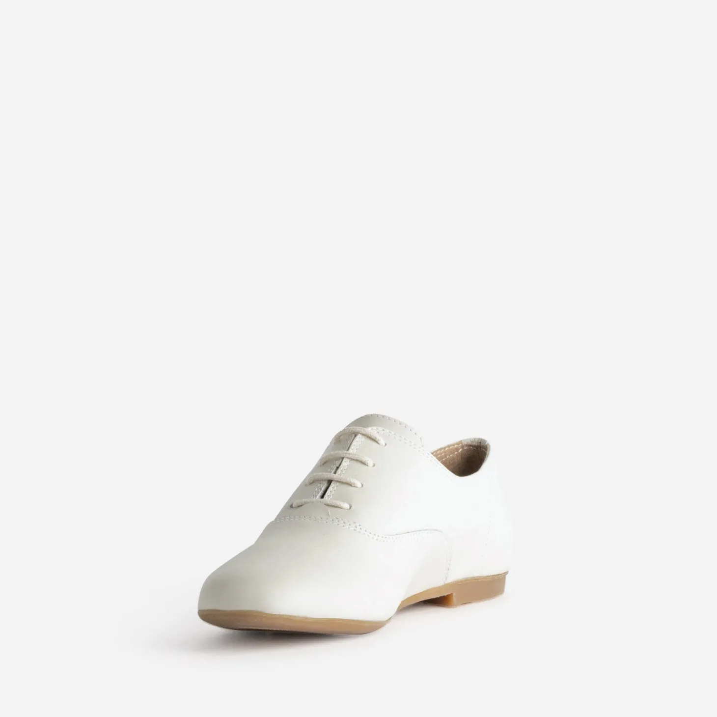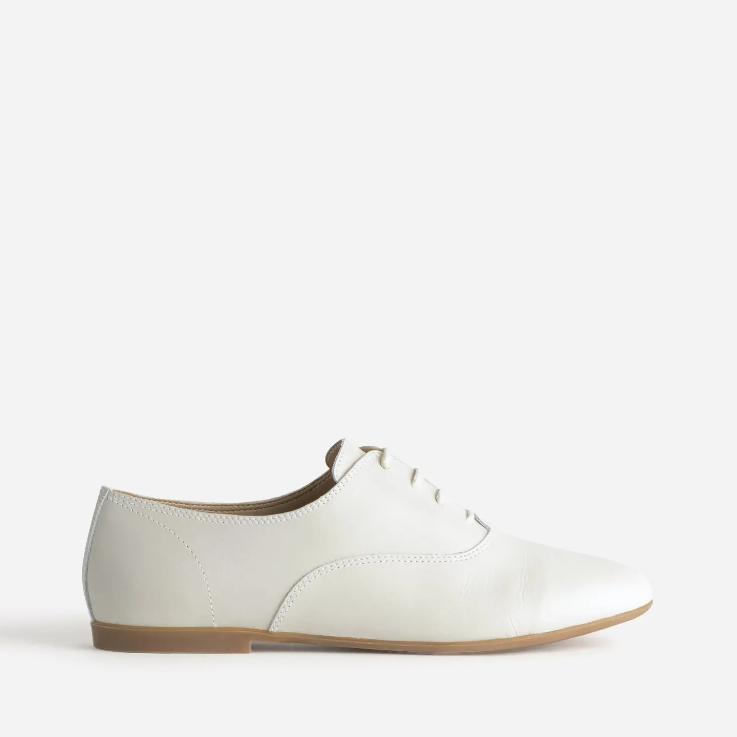 Emprunté au dressing masculin, le derby est toujours l’assurance d’un look élégant. En cuir écru, il se démarque par une finition mate et un lacet rond ton sur ton. Un modèle qui s’accommode aussi bien d’un tailleur-pantalon gris que d’une robe chemise noire à motif pois.