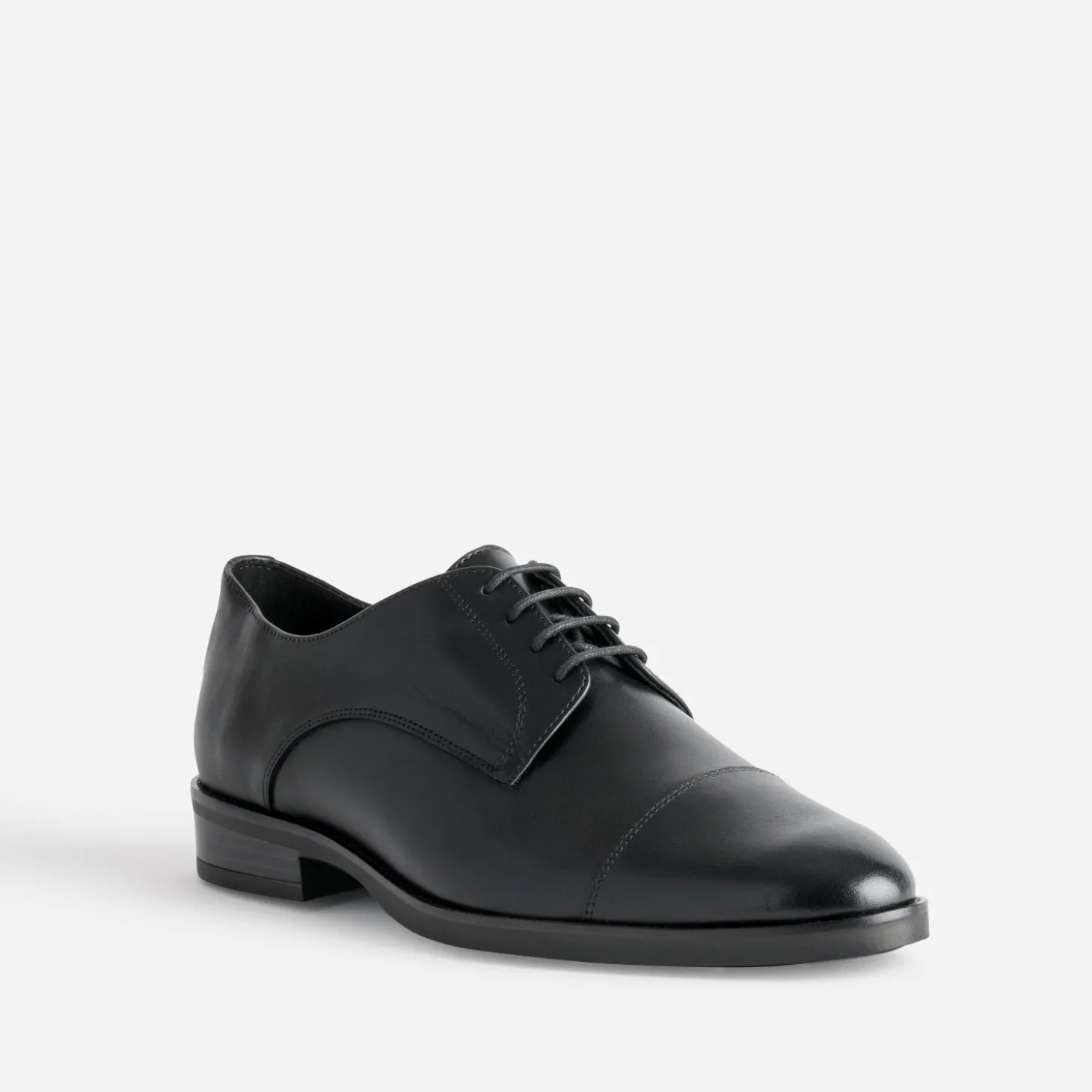 Le derby confirme son statut de soulier incontournable du vestiaire masculin. En cuir lisse noir, il est finalisé par un bout droit, qui renforce l’élégance de sa ligne. Un modèle à réserver avec un look formel, costume noir ou gris par exemple.