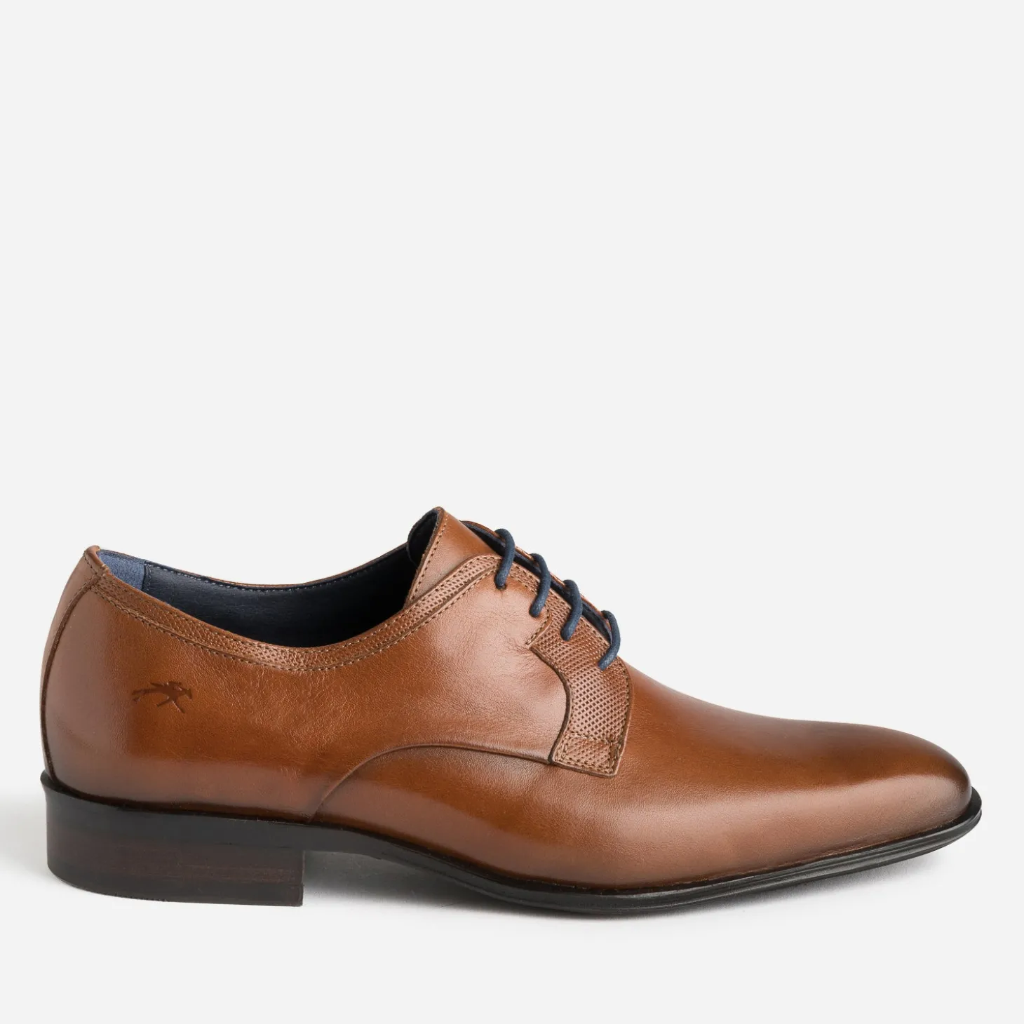 Côté derby aussi, le confort est de mise. En cuir lisse cognac, il se démarque par un bout affiné et une doublure bleu marine, assortie au lacet rond ciré. Un modèle à privilégier avec un costume foncé, bleu, gris ou noir.