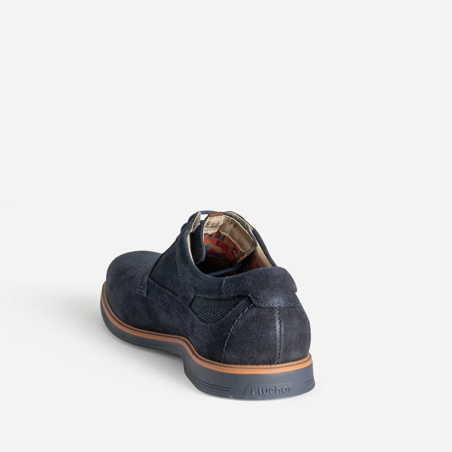 Cuir velours souple, coloris bleu marine, le derby pour homme reste un incontournable des souliers masculins. Les quartiers se démarquent par un embossage, et la trépointe, par une touche de camel, et la doublure, par un motif imprimé et coloré. Un modèle à préférer, au quotidien, avec une chemise bleu ciel et un pantalon chino beige.