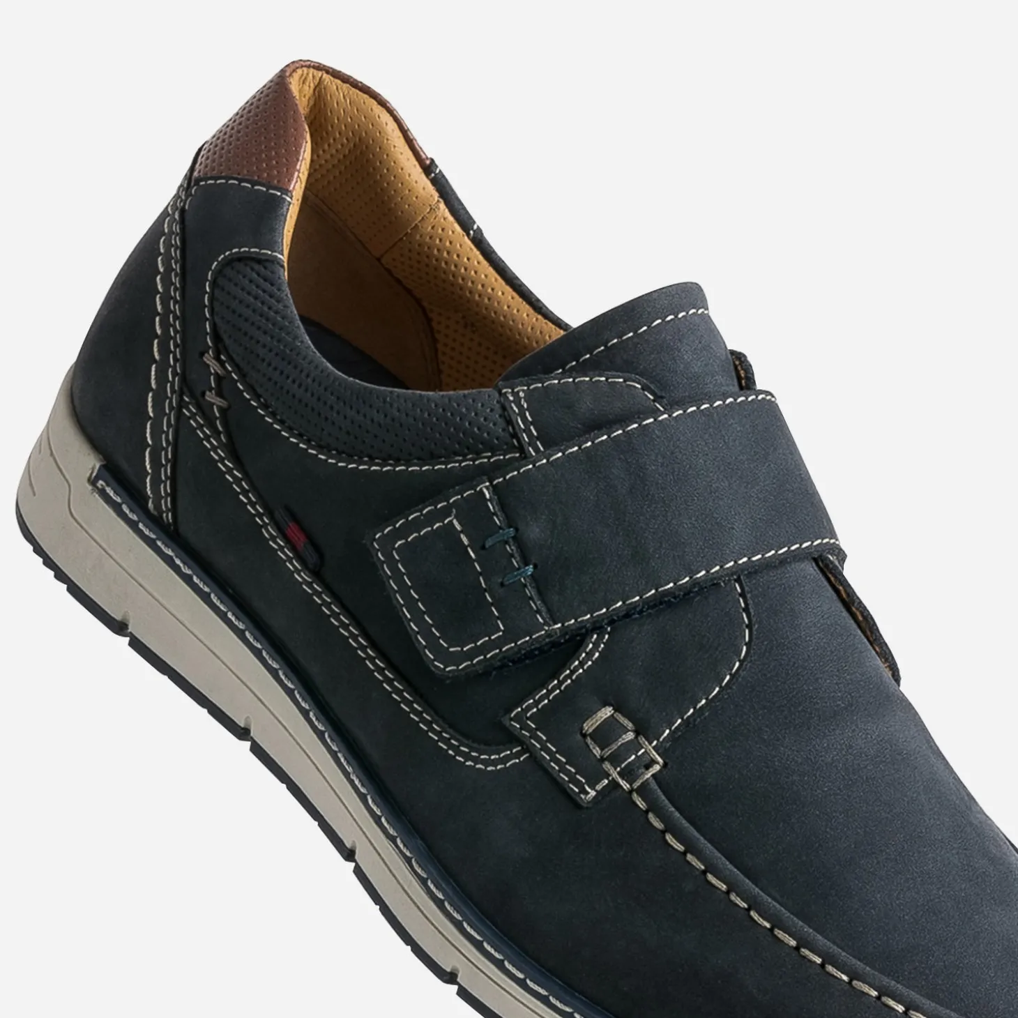 Redécouvrez le derby dans une version confort, avec semelle intérieure amovible et fermée par une large bride à scratch. En cuir nubuck, il se décline en coloris bleu marine, rythmé de surpiqûres contrastées, d’un contrefort marron et d’une doublure mix matières ocre. Préférez le confort au quotidien, avec toutes vos tenues.