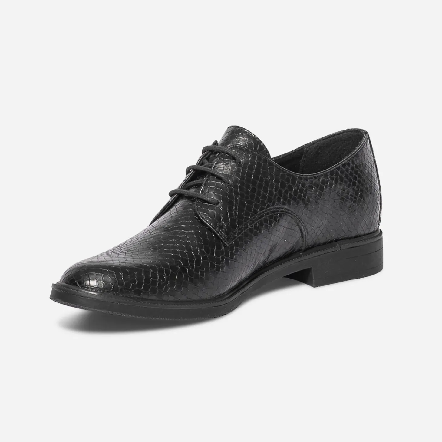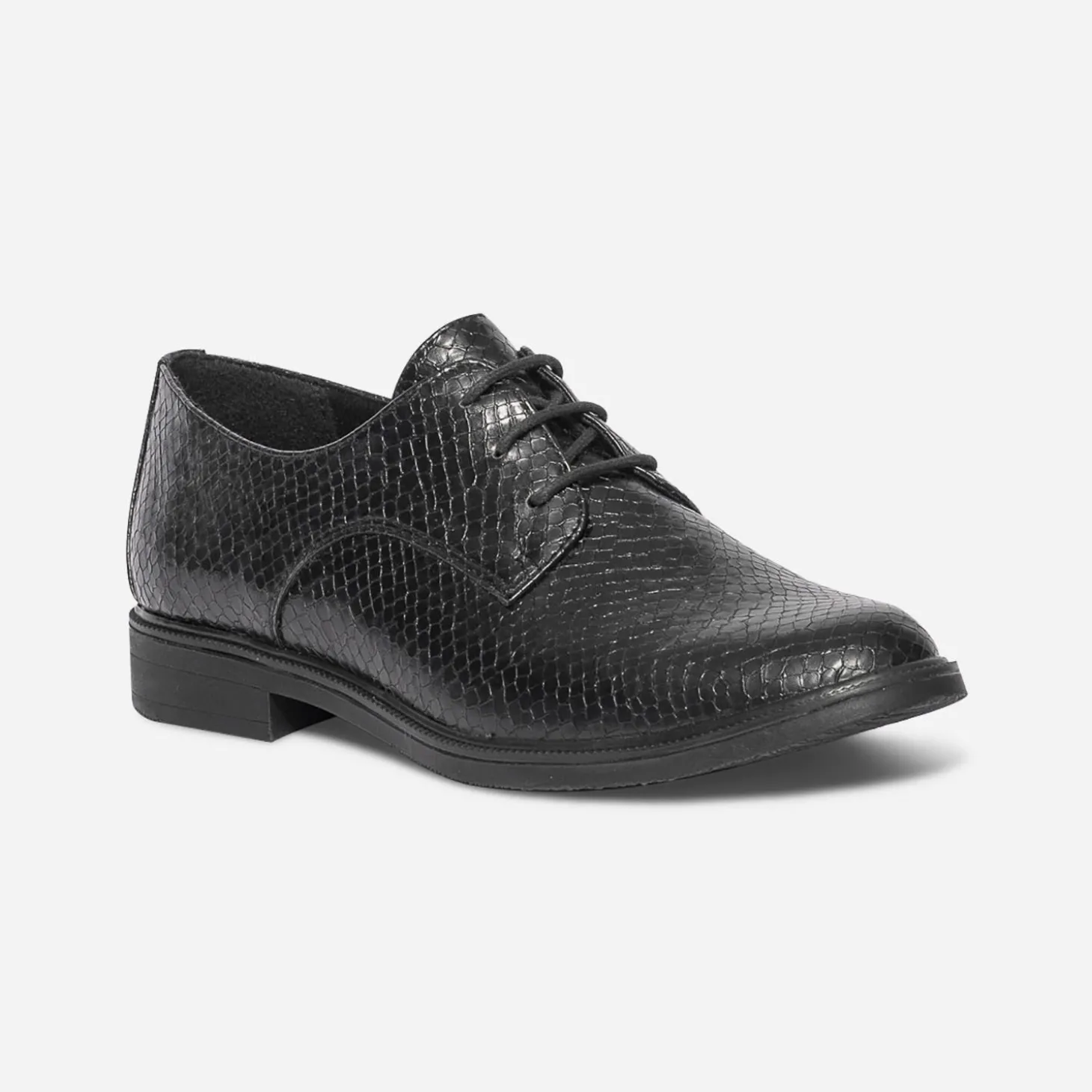 Vous pensez obsession ? On vous répond addiction ! Cet hiver, impossible de passer à côté de la tendance python. L’embossage animalier investit ce derby en cuir synthétique noir. Avec, préférez un look sobre, pour apprivoiser son côté sauvage, comme un pull et un pantalon cigarette.