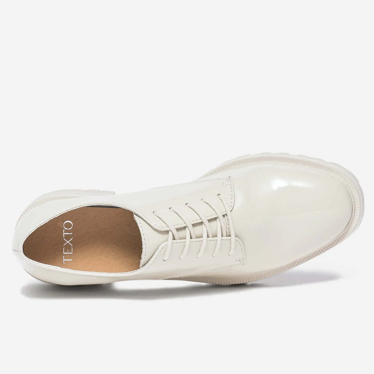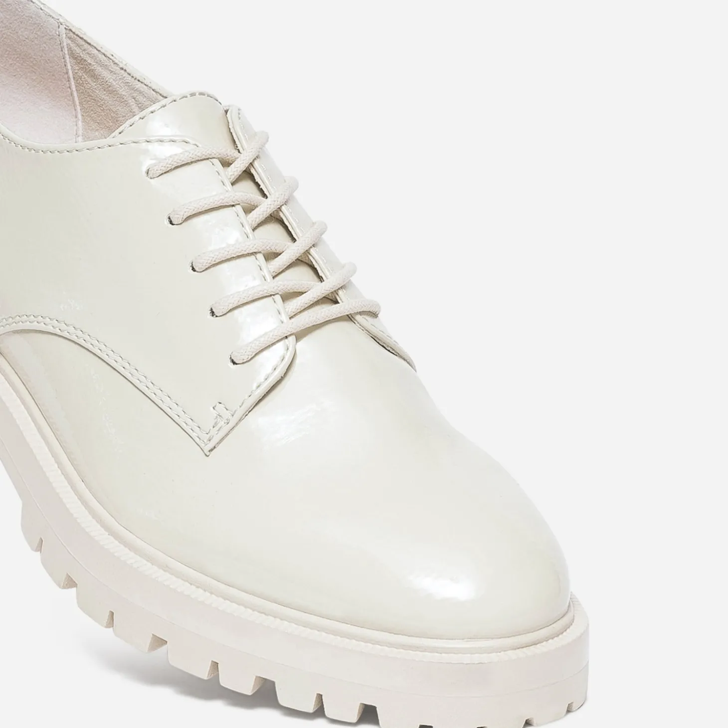 1. Une semelle épaisse et crantée, d’une parfaite stabilité. 2. Un coloris écru et une finition vernie, qui apporte du chic. Voilà 2 bonnes raisons de vous laissez tenter par ce derby pour femme. Synthétique, il présente une doublure textile et une première en cuir. Un modèle monté sur talon de 4 cm, pour vous accompagner, au quotidien et sans contraintes, dans tous vos déplacements.