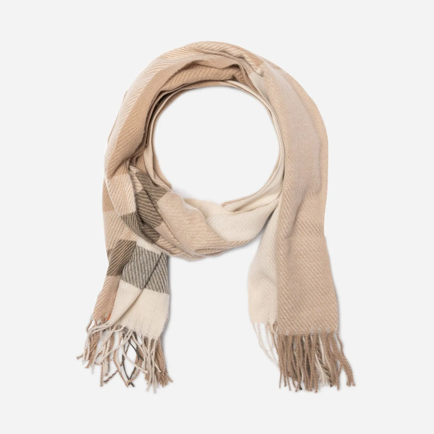 L’accessoire qui réchauffe l’hiver, c’est, évidemment, l’écharpe. Choisissez-la dans une teinte neutre, comme le beige, rythmée de larges rayures blanches et kaki. Imaginez-la sur un long manteau camel, une chemise blanche, un jean brut et des mocassins en cuir velours kaki.