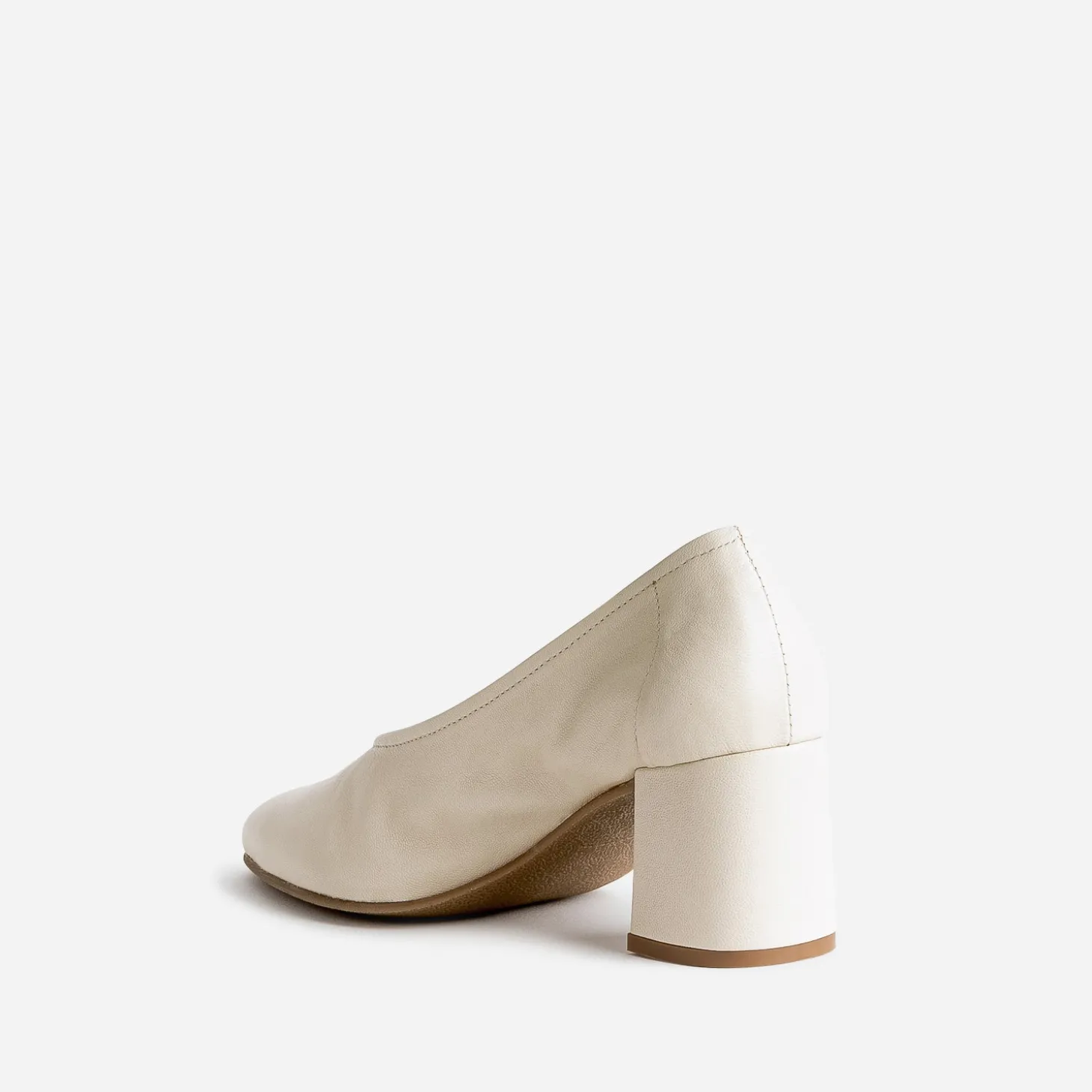 Esprit rétro affiché avec ce nouvel escarpin pour femme au design si singulier. En cuir beige, il se différencie par un talon flare, un bout pointu et surtout, un décolleté couvrant. Un modèle très souple, à tester avec un look rock, baroque ou carrément street.
