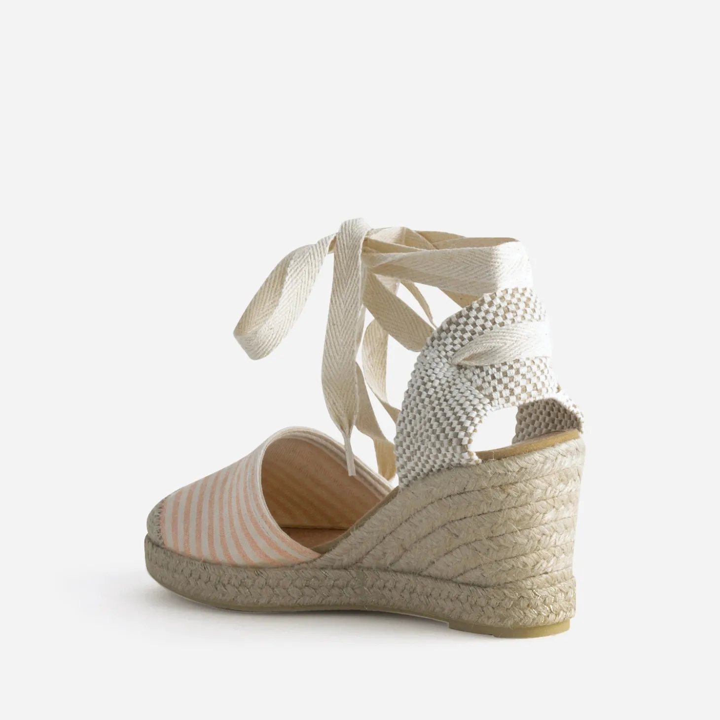 L’espadrille compensée, complice des tenues de mi-saison, se réinvente dans une toile rayée écrue et corail, fraîche et estivale. Elle est montée sur un talon en corde de 8 cm, avec patin avant de 2 cm et fils dorés sur le bord de la semelle. Elle se ferme par un lacet plat à la cheville, intégré dans le contrefort souple. Un modèle inspiré du bord de mer, à confirmer avec une marinière beige, une jupe-culotte en lin kaki et un sac à main en raphia forme coquillage.