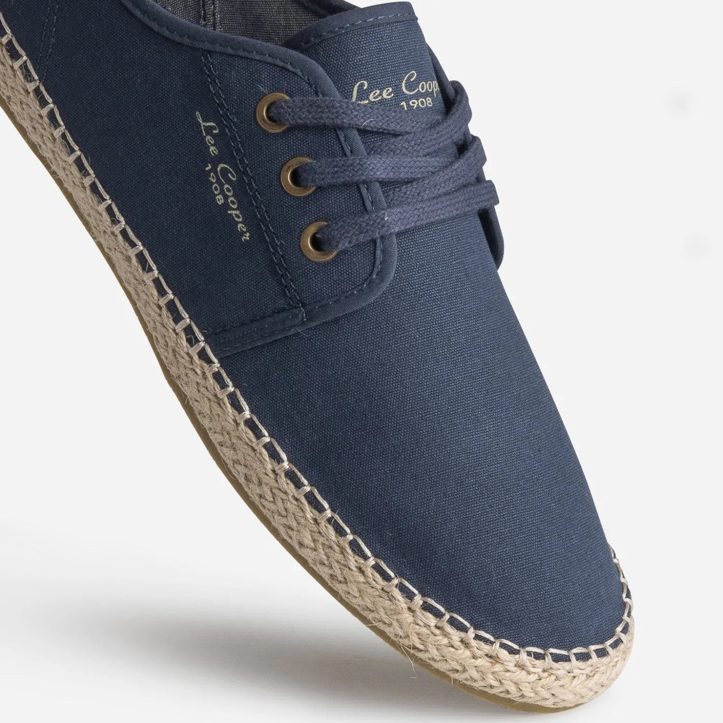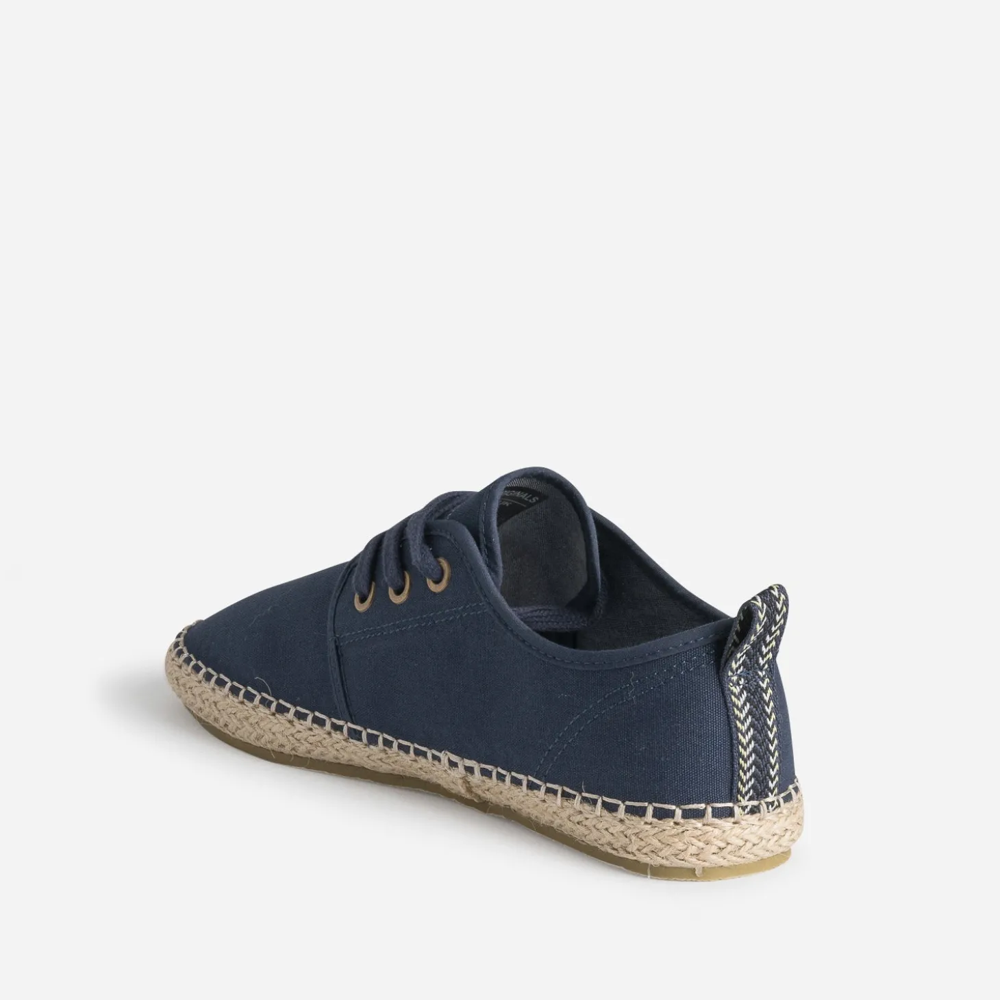 Appréhendez l’été sans compromettre votre style, avec cette chaussure hybride, mix parfait entre la tennis et l’espadrille. Confectionnée en toile bleu marine, avec doublure et première bleu chambray, elle est montée sur une semelle imitation crêpe, soulignée de corde naturelle. Un galon fantaisie placé sur le contrefort facilite l’entrée du pied. Un modèle à privilégier avec un tee-shirt ou une chemise légère et un bermuda beige ou kaki, en mode vacances.