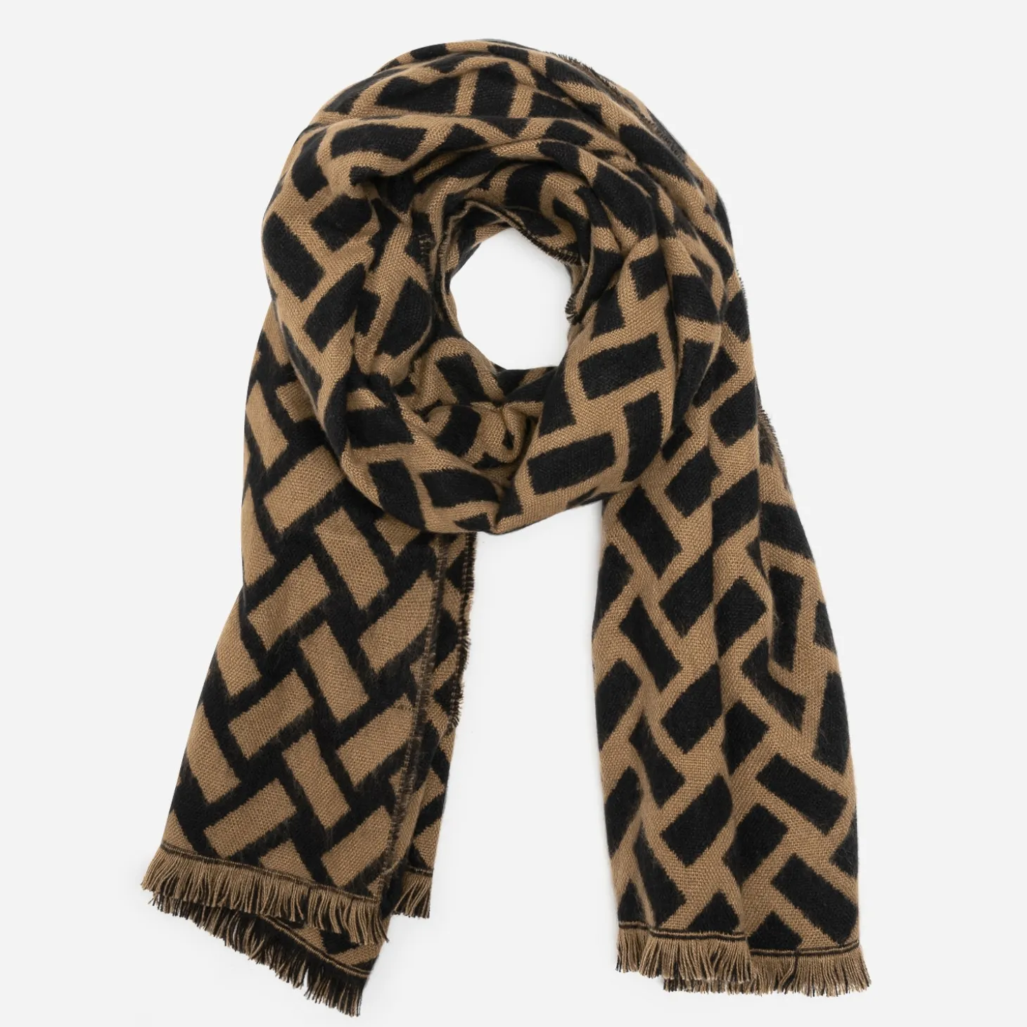 Lignes graphiques noires sur fond camel ou motifs géométriques camel sur fond noir. Cette grande étole est un accessoire incontournable des looks d’automne et d’hiver. Ses grandes dimensions permettent de s’y enrouler, sur un manteau dans les mêmes tons.