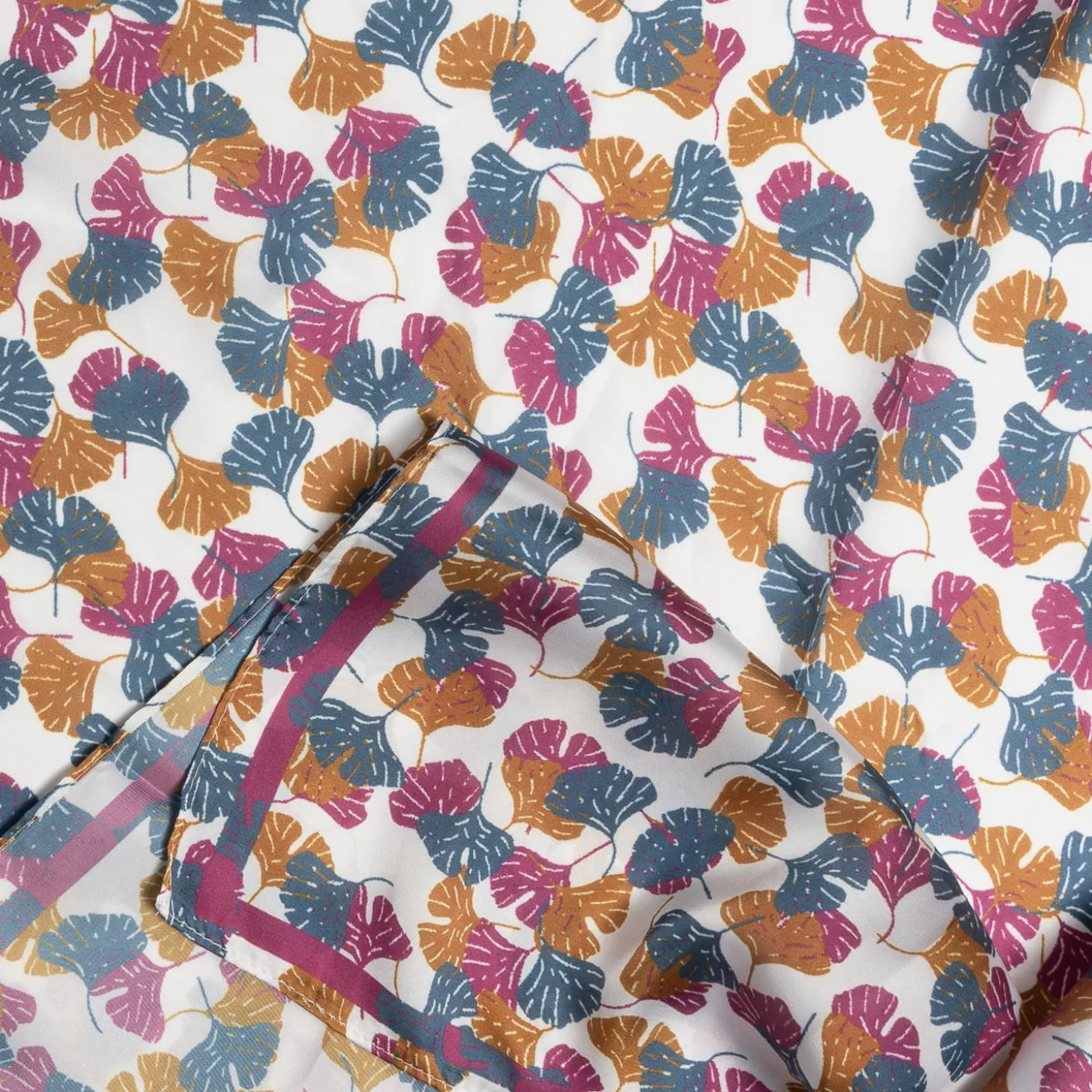 Bleues, camel et prune sur fond écru, les feuilles de ginkgo biloba animent ce foulard pour femme. Carré, il se noue autour du cou, dans les cheveux ou même sur l’anse d’un sac à main. A associer avec des pièces en denim bleu et des mocassins ou des sandales camel.