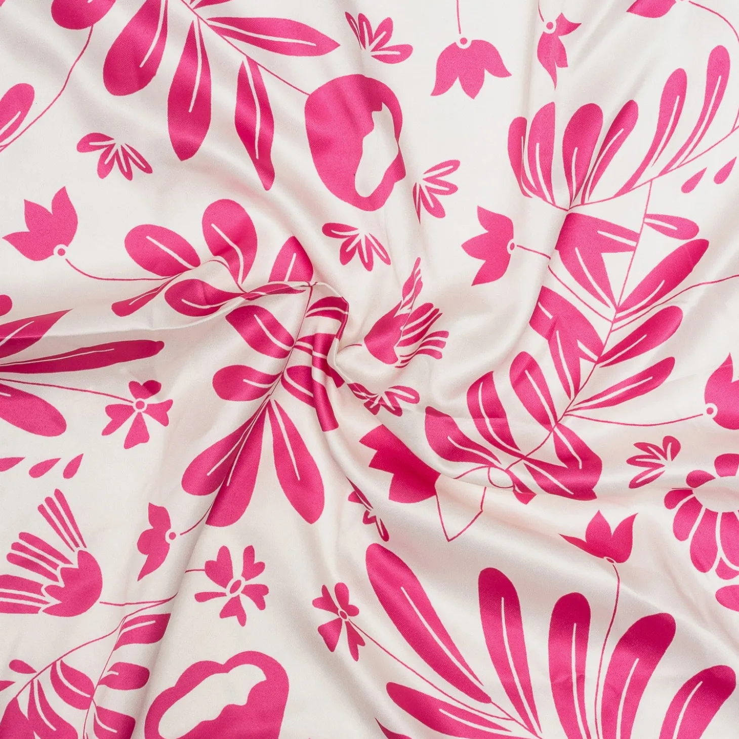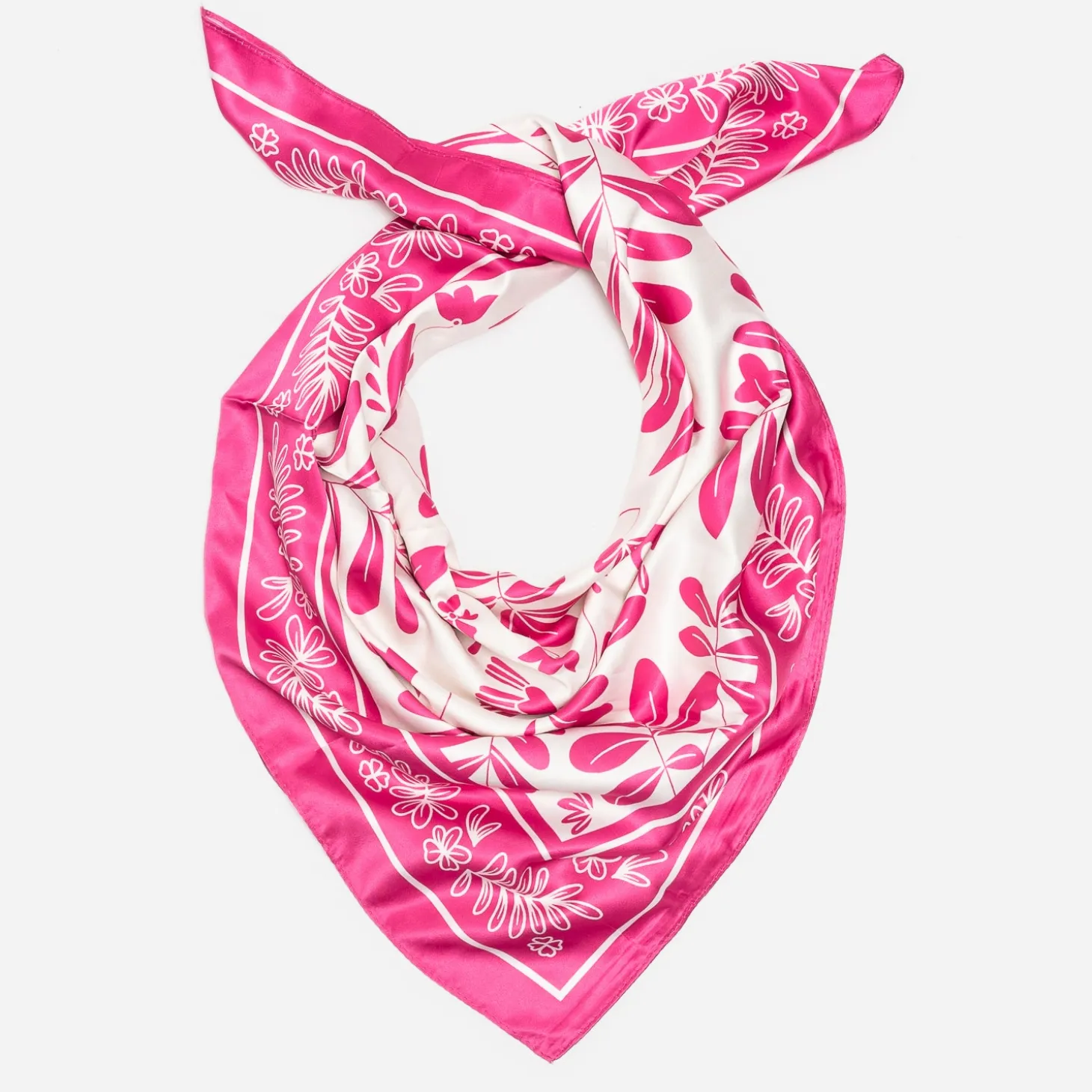 Bonne nouvelle ! L’imprimé floral observe une croissance constante. Installé dans les penderies tout au long de l’année, il se réinvente sur ce foulard satiné, dans les tons de rose et de blanc. Osez le nouer autour de votre cou ou dans vos cheveux, avec un pull rouge à col rond et un pantalon large beige.