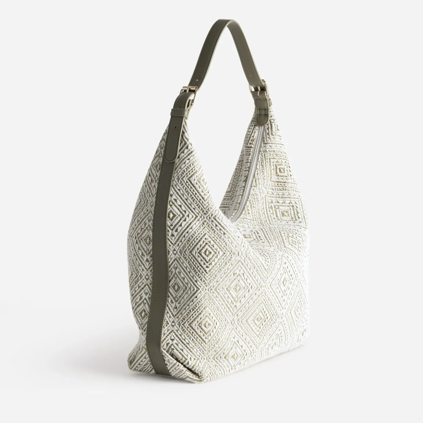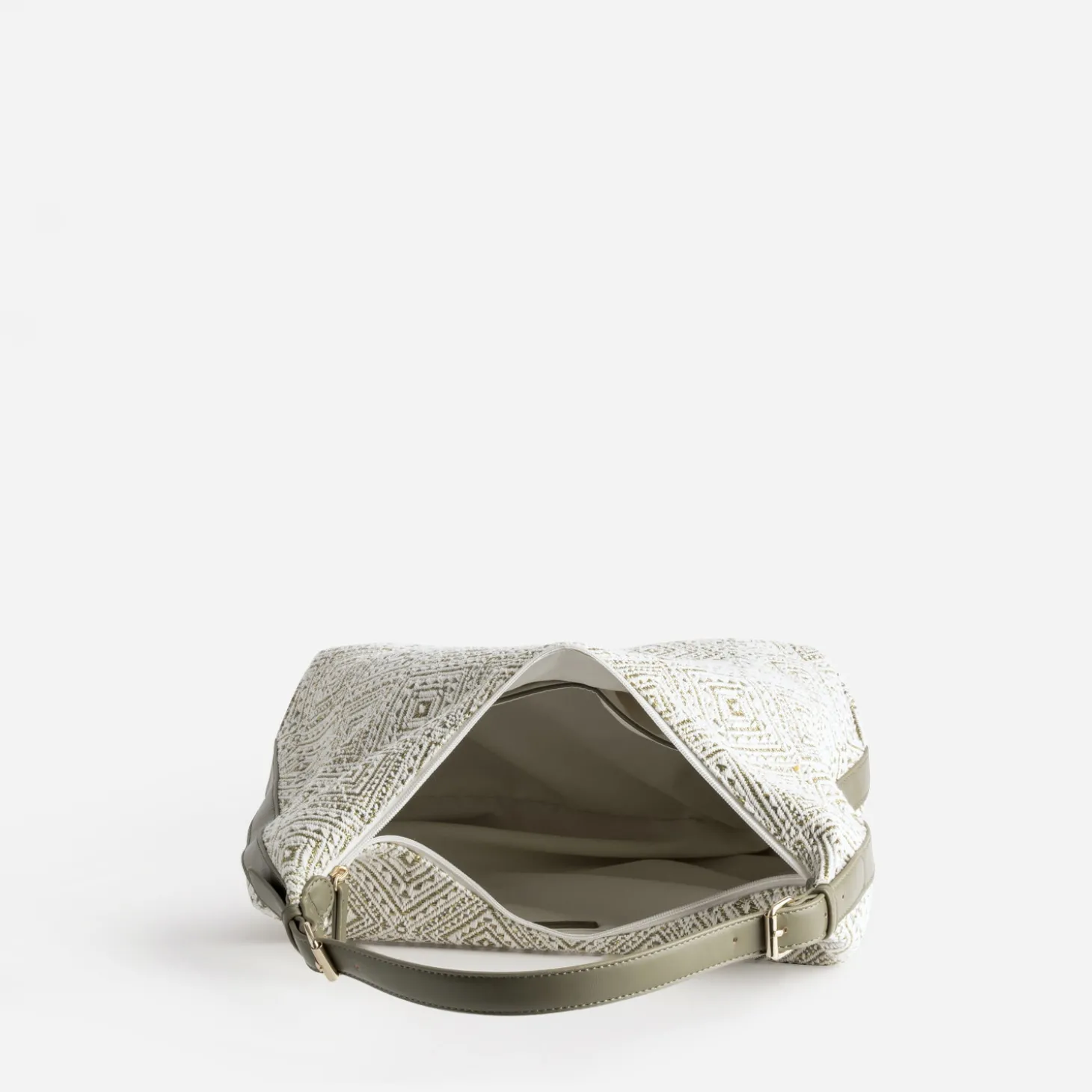Ce sac à main pour femme séduit d’abord par son grand volume, ensuite par son tissu brodé à motif géométrique dans les tons écru, kaki et doré. Il est souligné d’une bande kaki, assortie à l’anse ; une anse ajustable à l’épaule par deux boucles. Le compartiment intérieur est structuré par trois poches internes dont une zippée, pour faciliter l’agencement de vos effets personnels. Un modèle à pousser dans la tendance ethnique chic, avec un tailleur-pantalon beige ou kaki, avec une veste saharienne et des mules plates tressées.