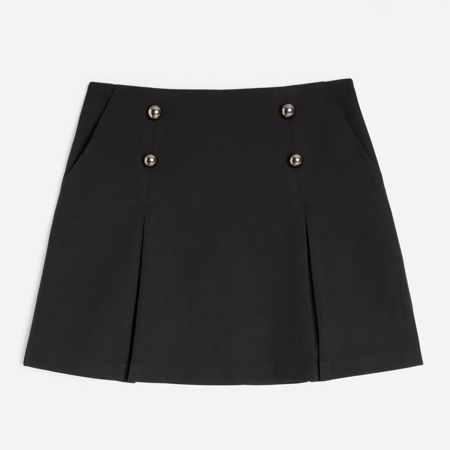 Coup de cœur pour cette jupe courte, en textile noir, pour un style preppy. Elle séduit par ses plis creux placés devant, et son esprit pont, assuré par 4 boutons boule en métal décoratifs. Un modèle à réserver avec un haut et des collants noirs.