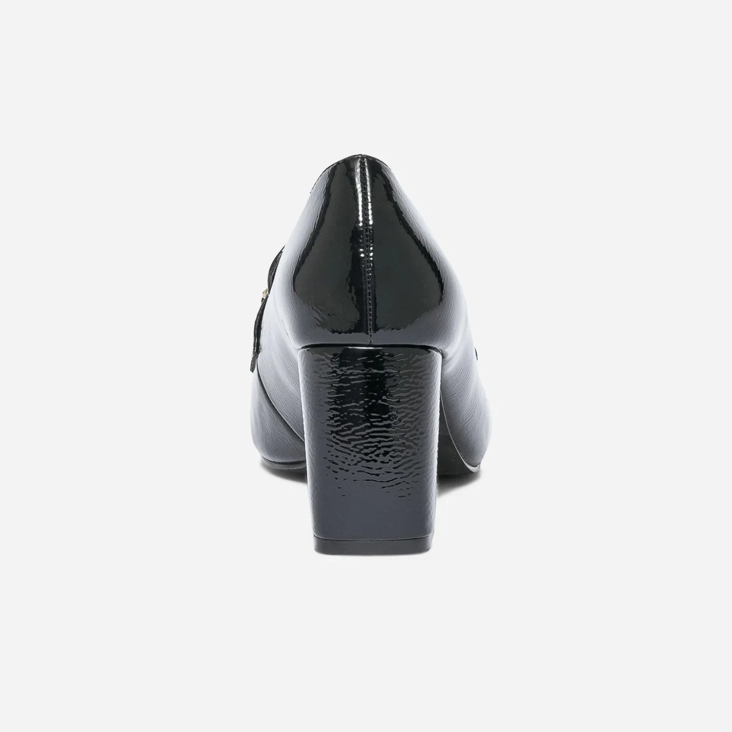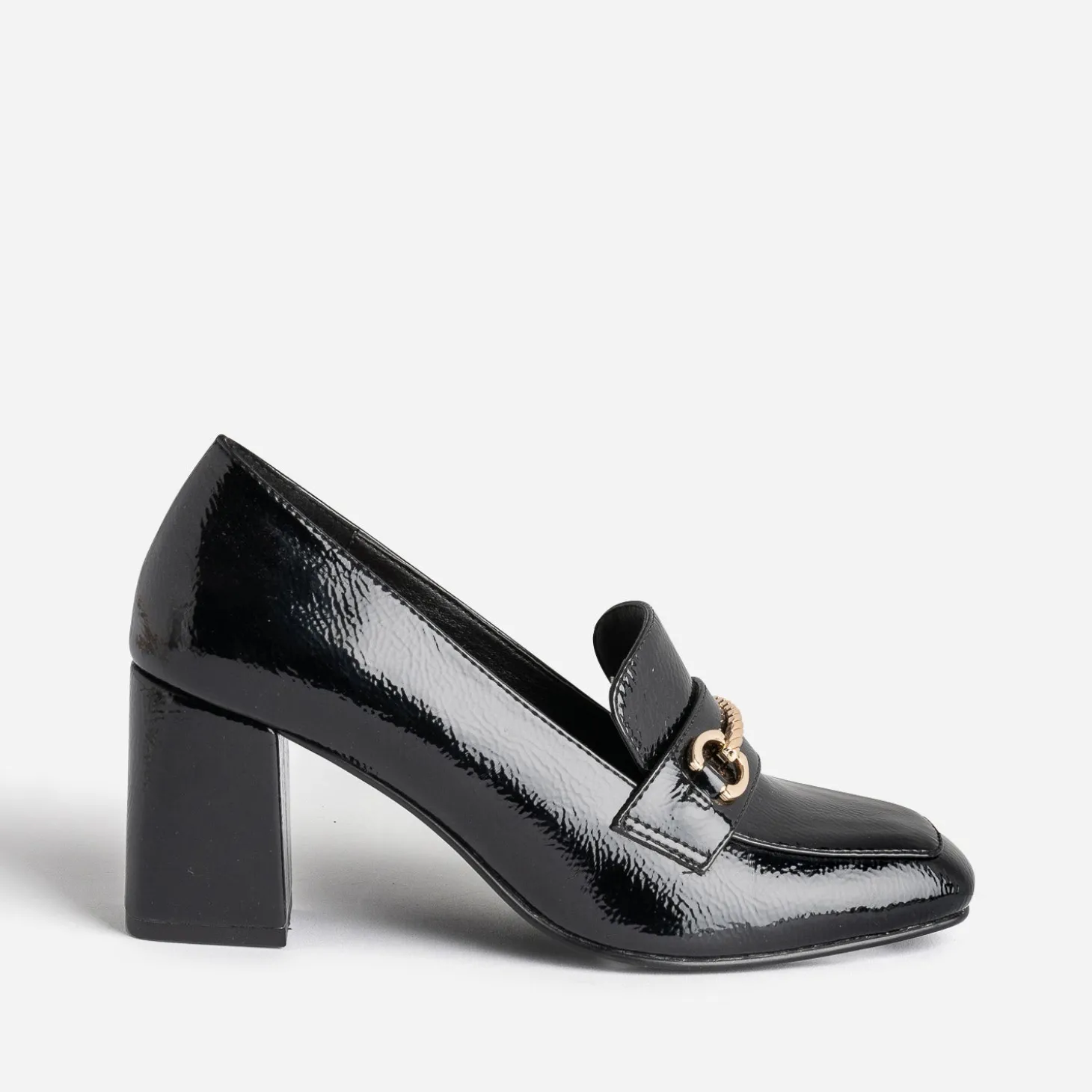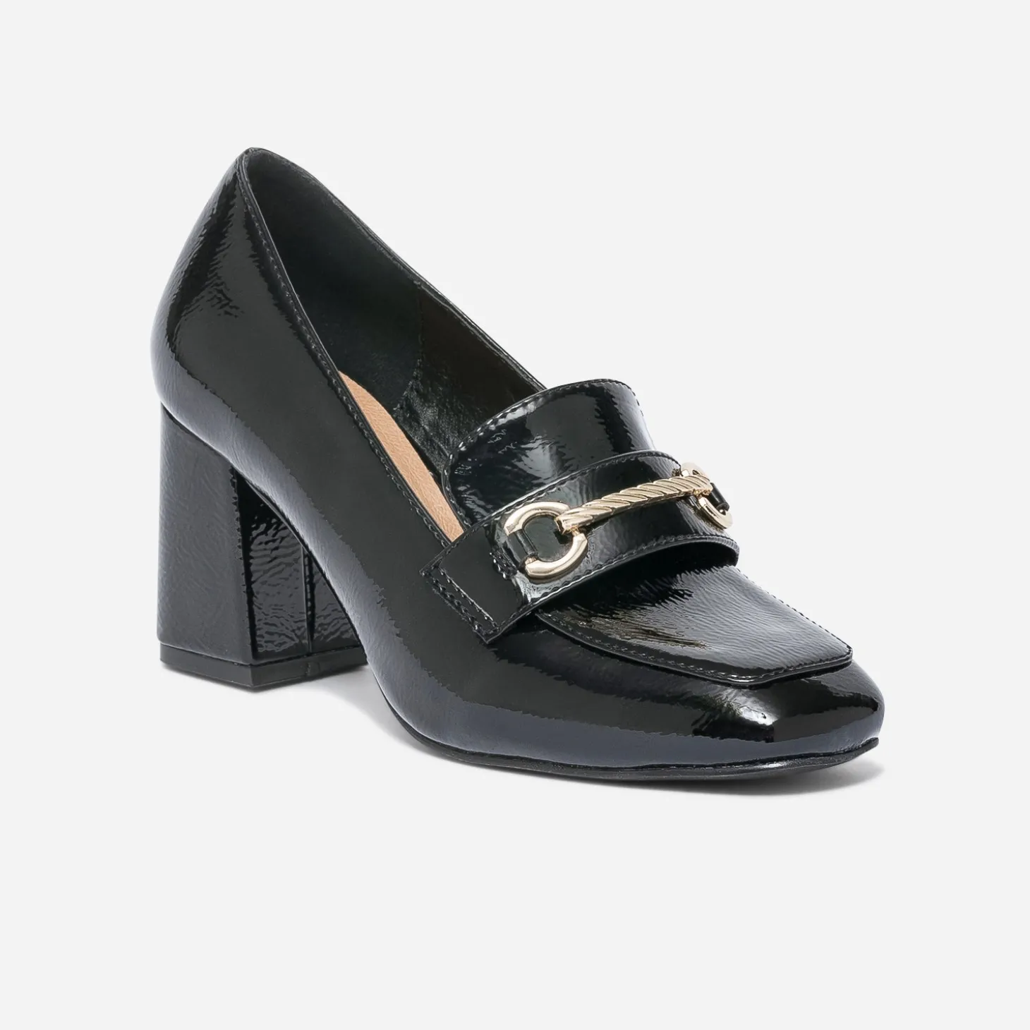 Coloris noir et finition vernie, jusqu’au talon. Talon carré à la fois large et haut de 7 cm, pour une meilleure stabilité. Mors fantaisie en métal doré, posé sur le dessus du pied. Ce mocassin multiplie les atouts pour séduire, la femme active, avec une robe chemise, la femme rebelle, avec une chemise à carreaux, la femme classique, avec une jupe midi.