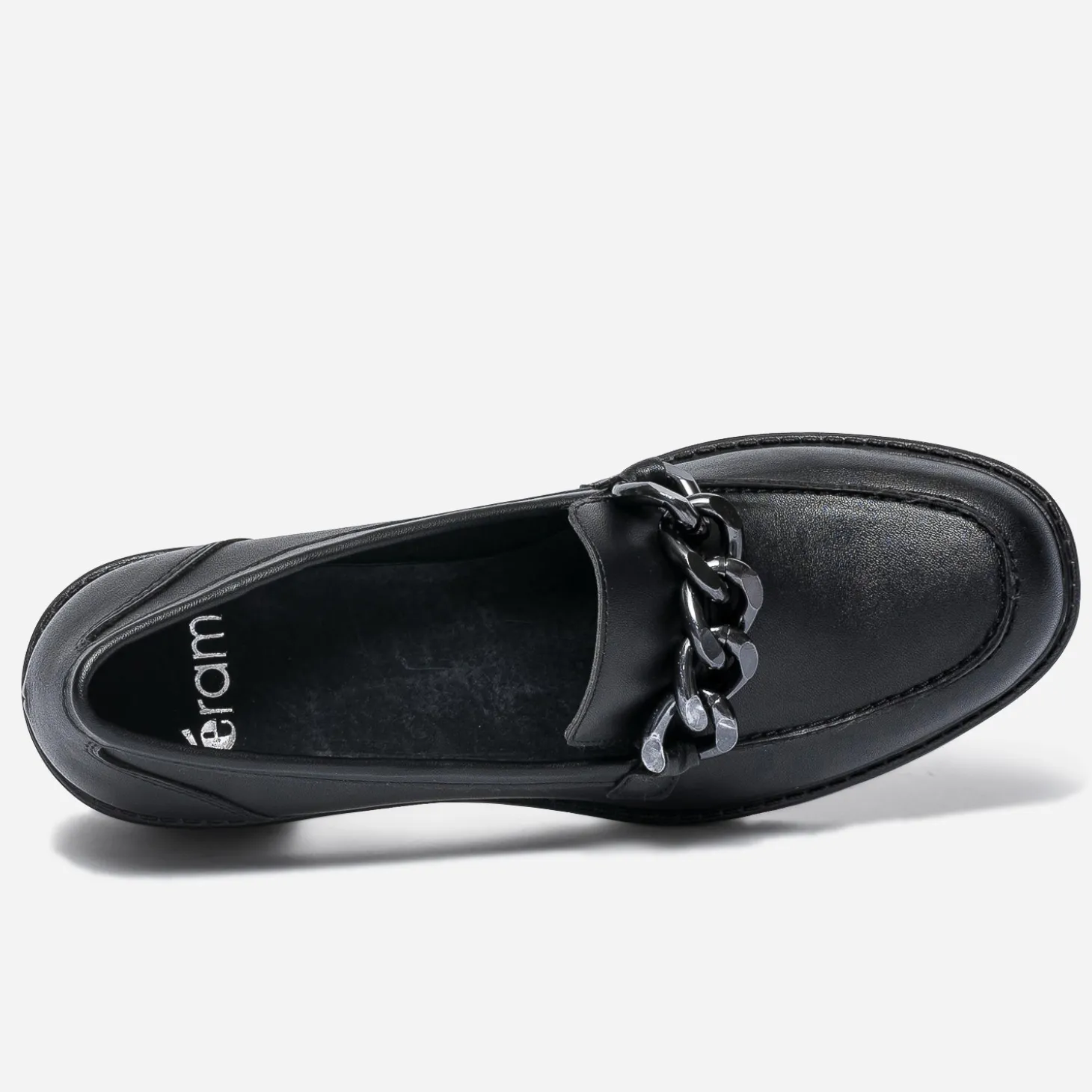 Monté sur un talon de 6 cm, le mocassin femme bouscule les codes. En matière synthétique noir, il présente une semelle crantée et une grosse chaîne en métal gun sur le dessus du pied. Facile à porter, facile à associer, ce modèle mérite d’être essayé.