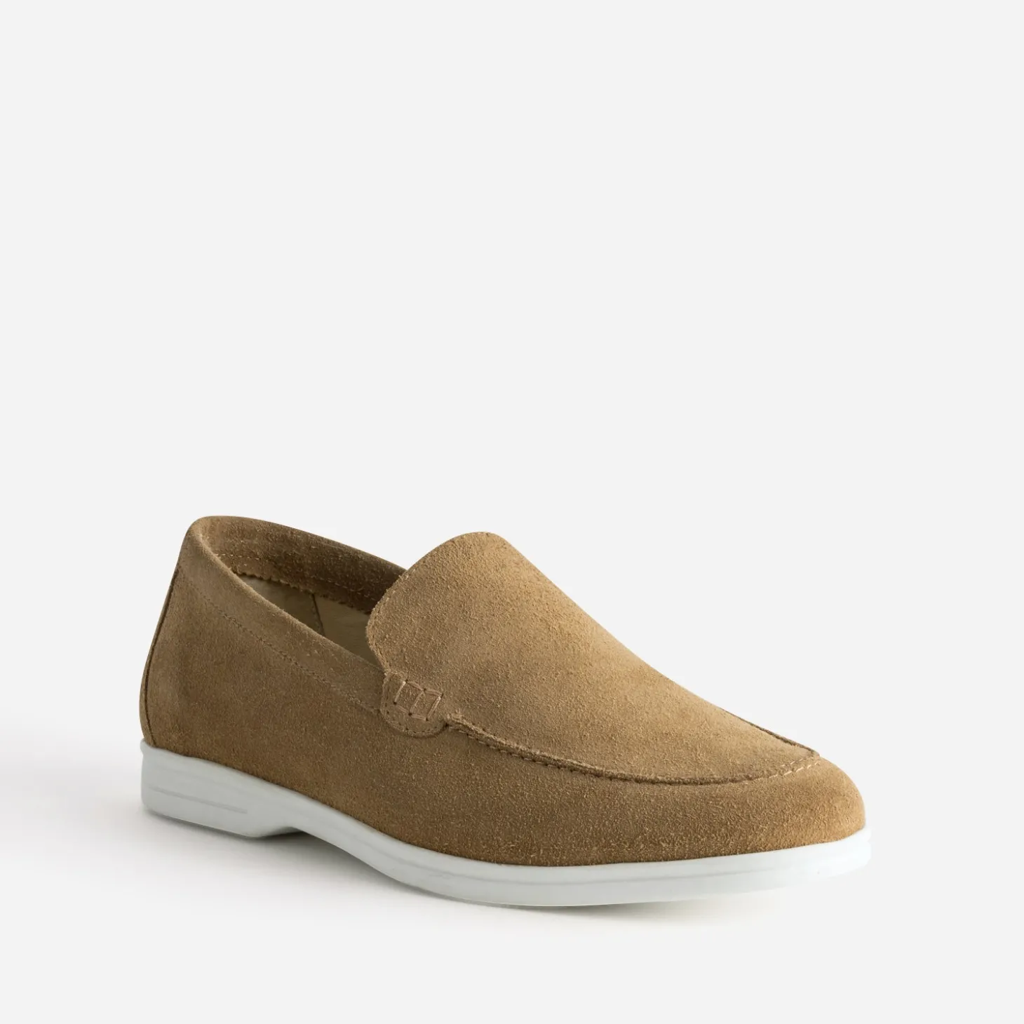 Ce mocassin pour homme en cuir velours beige est la pièce maîtresse d’un look estival réussi. Son design épuré et sportif, monté sur une semelle blanche, s’accorde parfaitement avec une chemise ciel rayée et un pantalon chino bleu foncé. Un modèle à porter pied nu pour une allure décontractée, dans l’air du temps.