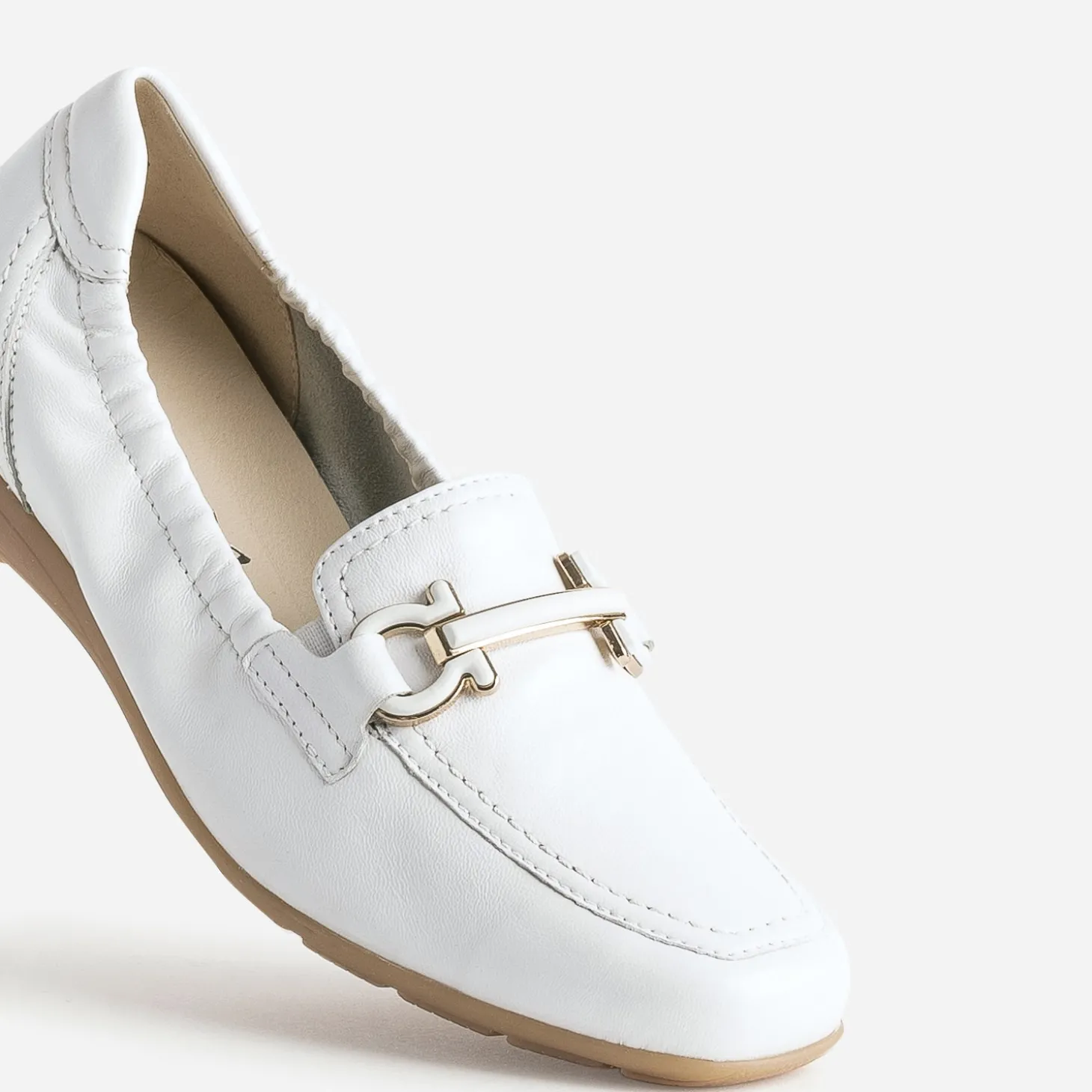 Tige élastiquée, semelle extérieure en gomme, semelle première en cuir dotée de la technologie ‘onAIR’, garantissant un meilleur amorti et une aération optimale de la chaussure : le nouveau mocassin gagne encore confort. En cuir souple non doublé, il se décline en coloris blanc avec finition légèrement nacrée. Le dessus du pied est décoré d’un mors fantaisie ton sur ton. Un modèle à privilégier, par exemple, avec un costume-pantalon beige.