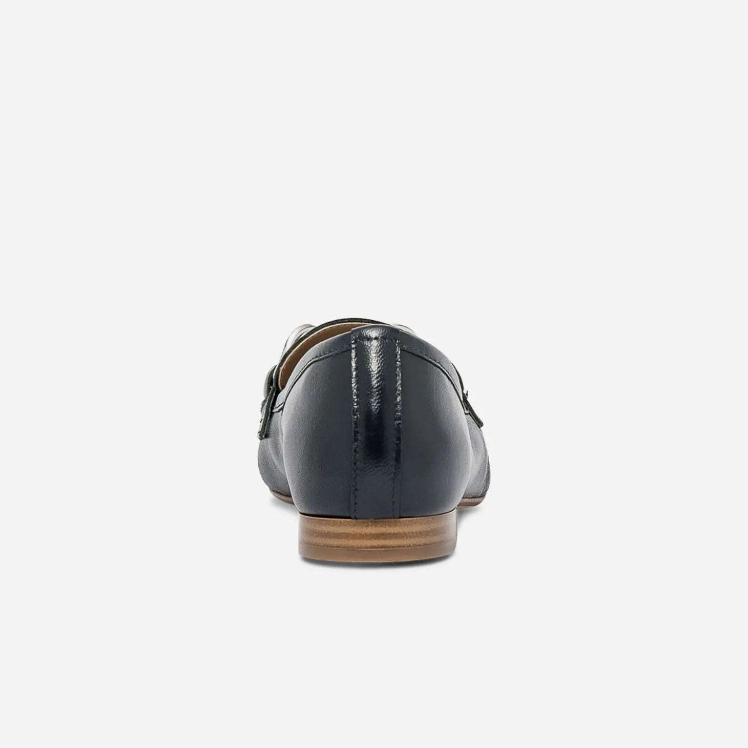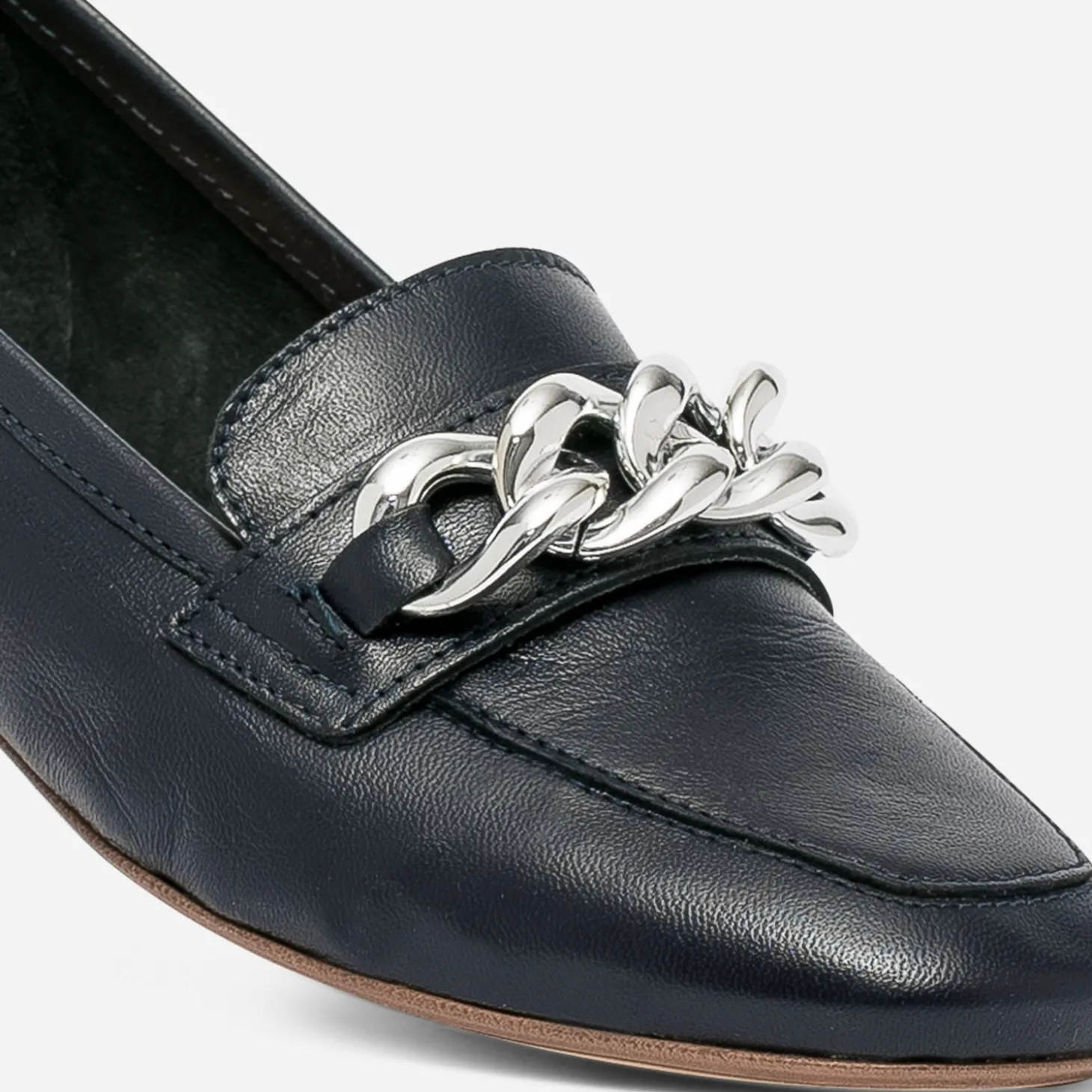 C’est une certitude : le mocassin pour femme est toujours à la pointe des tendance mode de la saison. En cuir lisse, il est non doublé, pour profiter d’une vraie souplesse, et se décline dans un sublime coloris bleu marine, sobre et intemporel. Sur le dessus, une maxi chaîne en métal argenté apporte une touche bcbg, à assumer avec une veste de costume bleu marine et un slim brut ou à décaler avec un look monochrome.