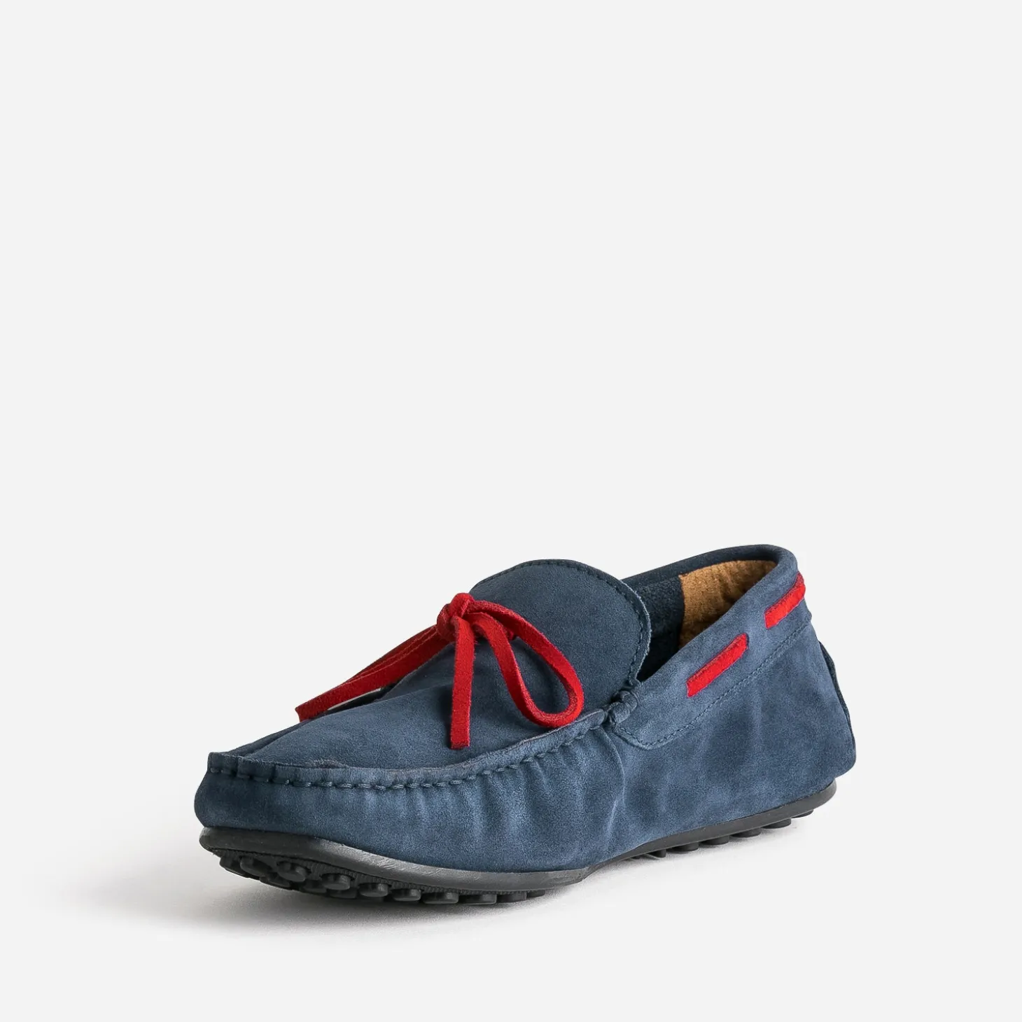 Voyez l’été en couleur ! Pour l’occasion, le mocassin homme s’autorise un sublime bleu marine, souligné d’un lacet rouge vif. Son confort et sa souplesse reconnus sont mis en valeur par un cuir velours et des finitions soignées. Préférez-le pied nu, avec une chemise blanche et un pantalon chino bleu.