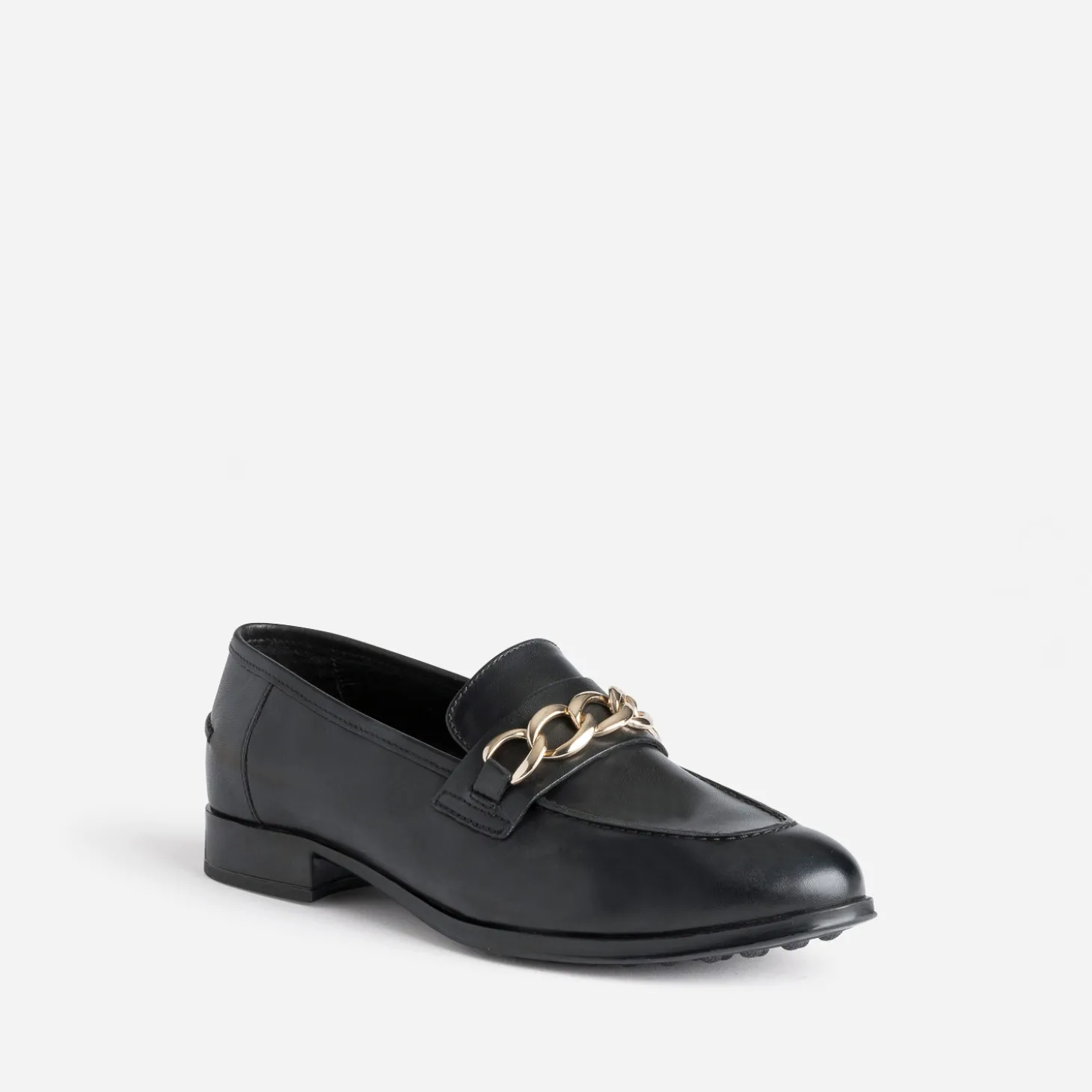 Toutes les modeuses en conviendront : le mocassin pour femme est toujours d’actualité. En cuir lisse noir, il présente une doublure bi matière en cuir et textile et une première en cuir. Le dessus du pied est décoré d’une grosse chaîne en métal doré. Un modèle à associer avec un pull gris à col V, un leggings en cuir et un manteau noirs, pour un look working girl moderne.