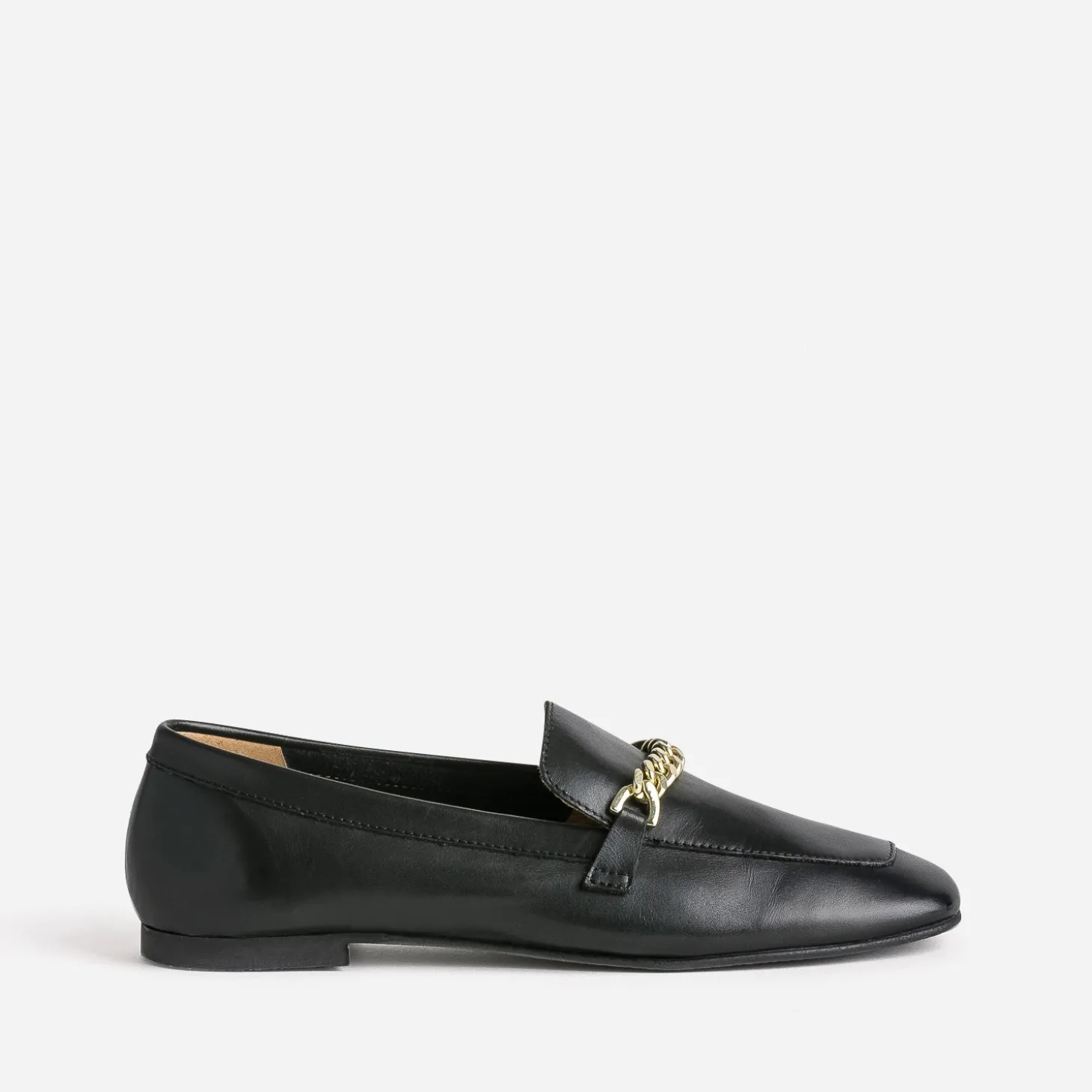 Le mocassin assume son côté premier de la classe. En cuir lisse, il se décline en coloris noir, décoré, sur le dessus, d’une chaîne en métal doré, façon bijou. Plat, il définit une envie chromatique plus neutre, avec un costume-pantalon.