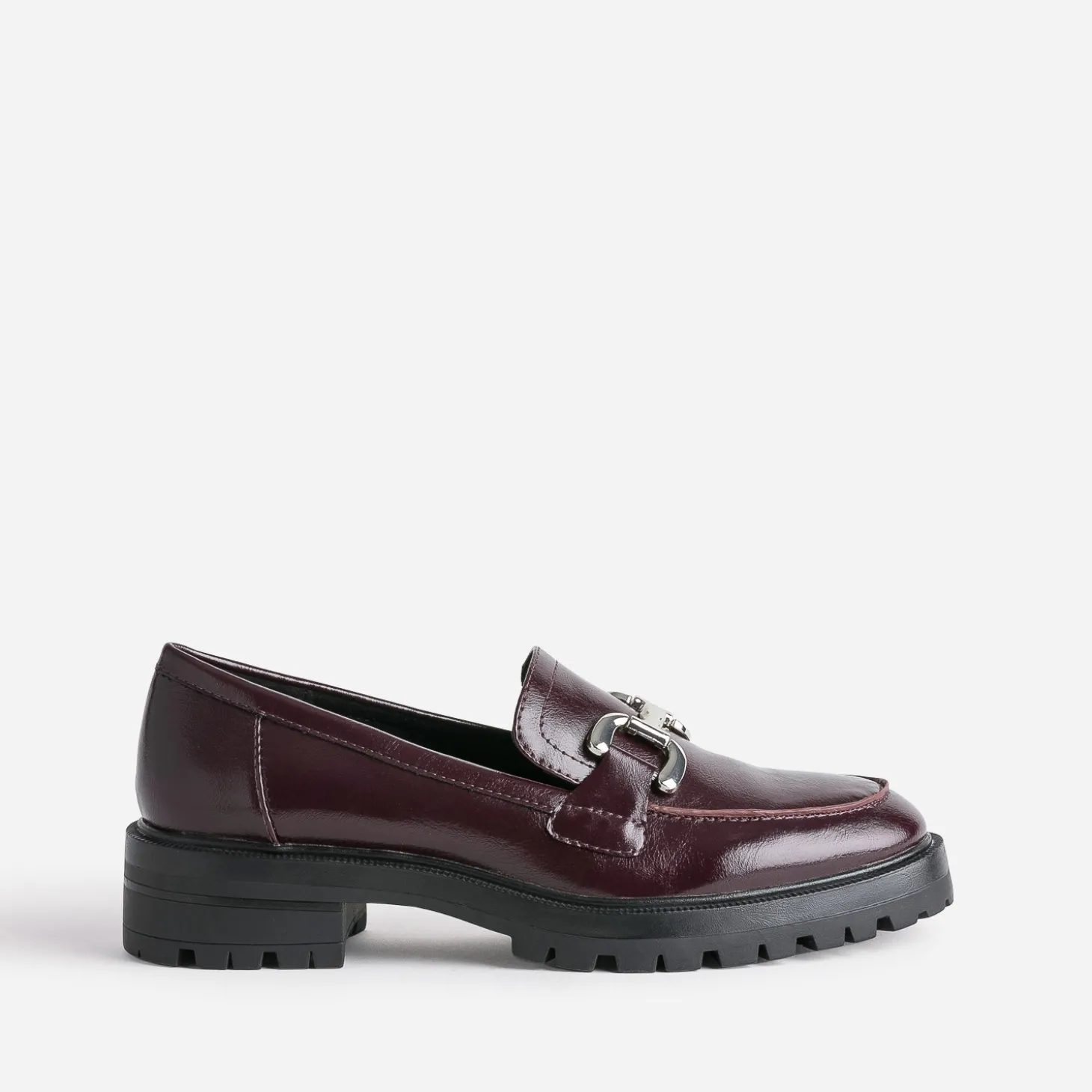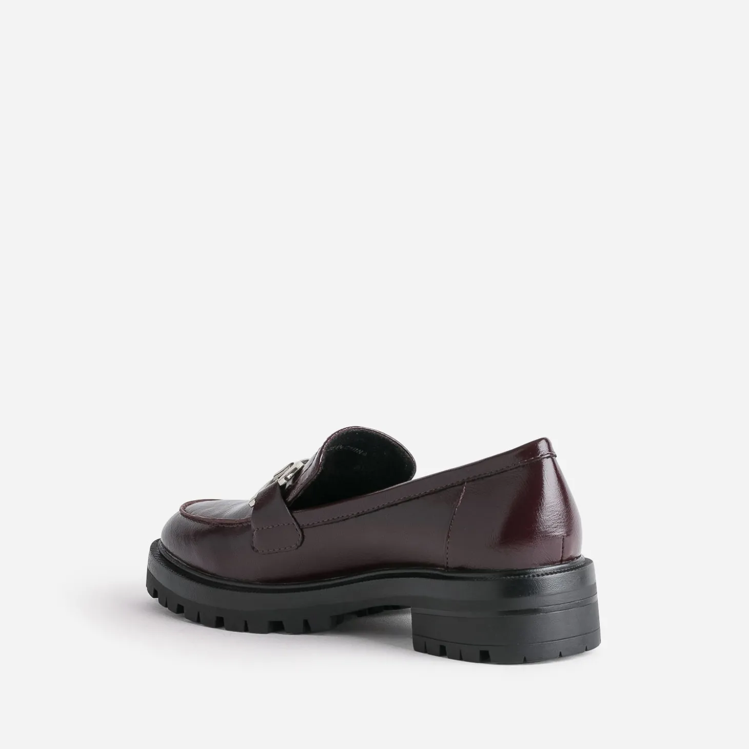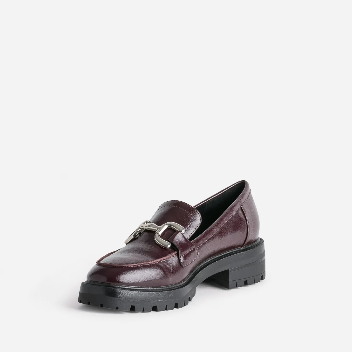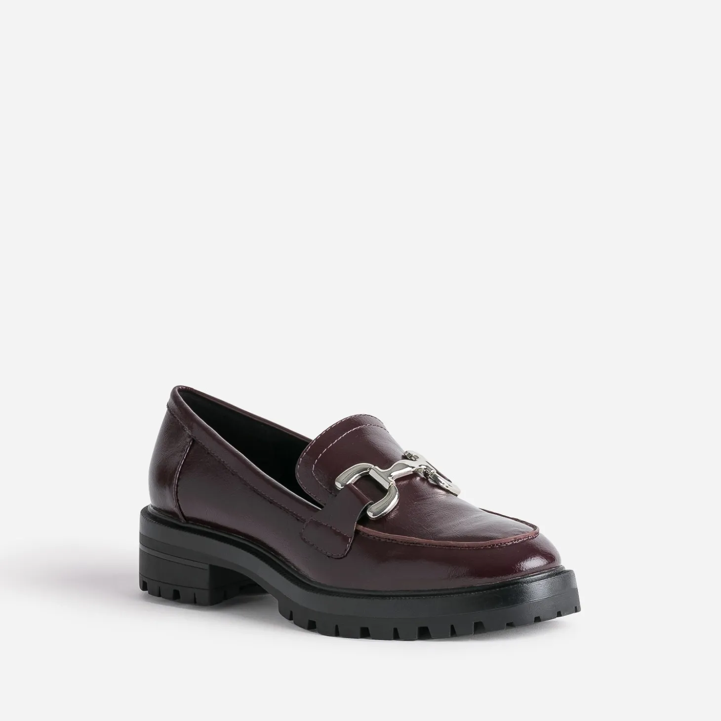Rien de mieux pour ‘garder les pieds sur terre’ qu’un mocassin à semelle crantée ! En matière synthétique bordeaux, avec finition glacée, il est décoré d’un maxi mors en métal argenté. Privilégiez-le avec un top blanc, une jupe courte et des socquettes blanches, pour un look preppy chic dans l’air du temps.