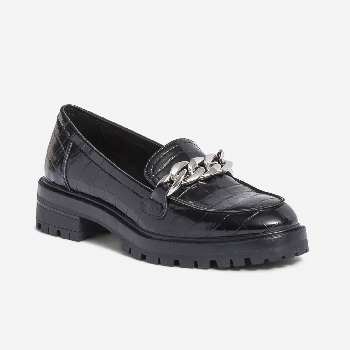 Oubliez tout ce que vous saviez sur le mocassin femme. Cette saison, il impose, on ose ! Semelle crantée, talon large, embossage effet croco et grosse chaîne en métal blanc, il conserve un coloris noir qui matche avec tout. Un modèle à essayer avec une jupe longue et plissée ou avec une tenue qui mixe avec soin les imprimés.