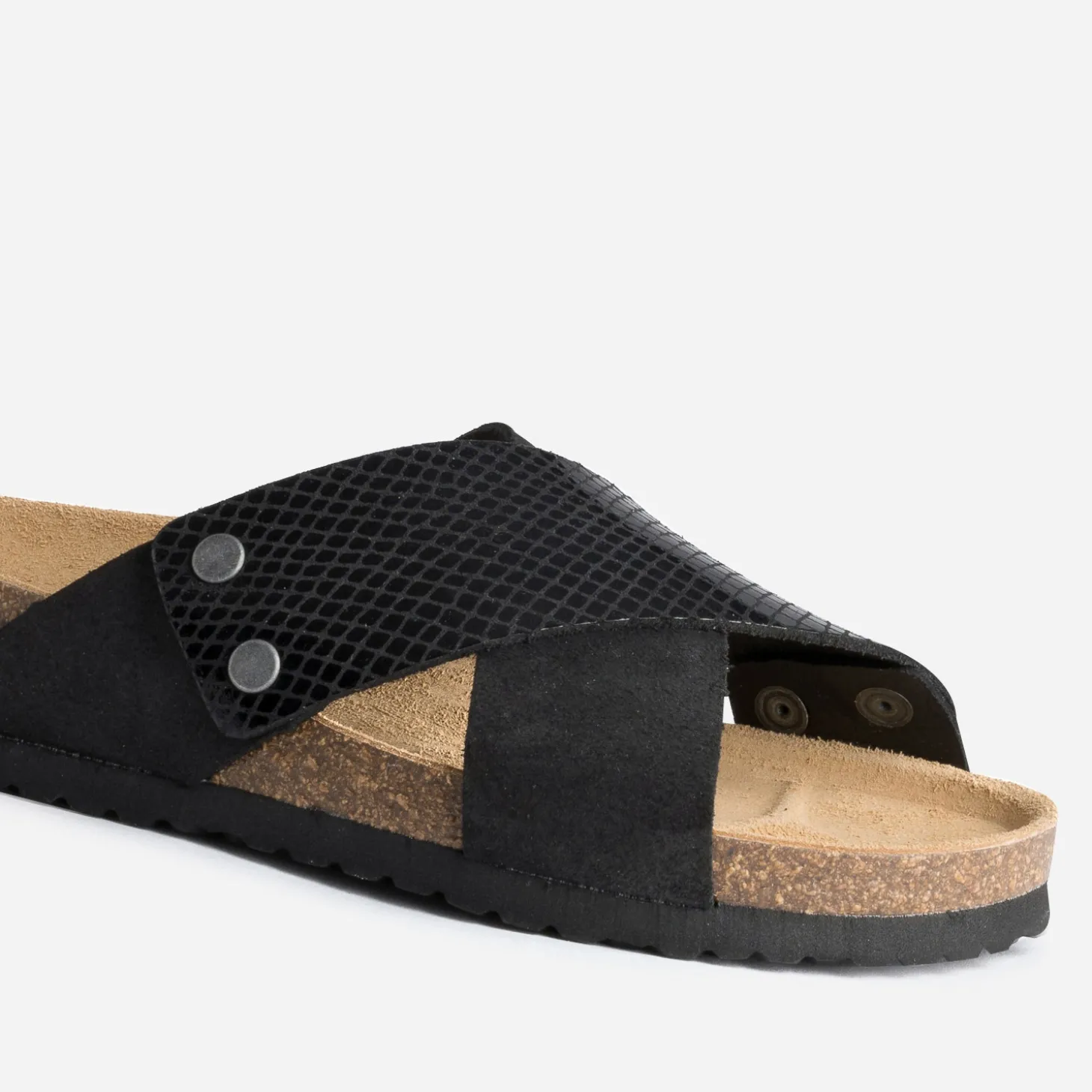 Deux larges brides, croisées sur le dessus du pied. Du cuir velours, coloris noir. Un imprimé animalier, avec finition vernie. Quatre clous pour décorer. Une semelle anatomique en cuir velours, pensé pour soulager la plante du pied. Un modèle intemporel, à préférer avec une tenue décontractée, tout au long de l’été.