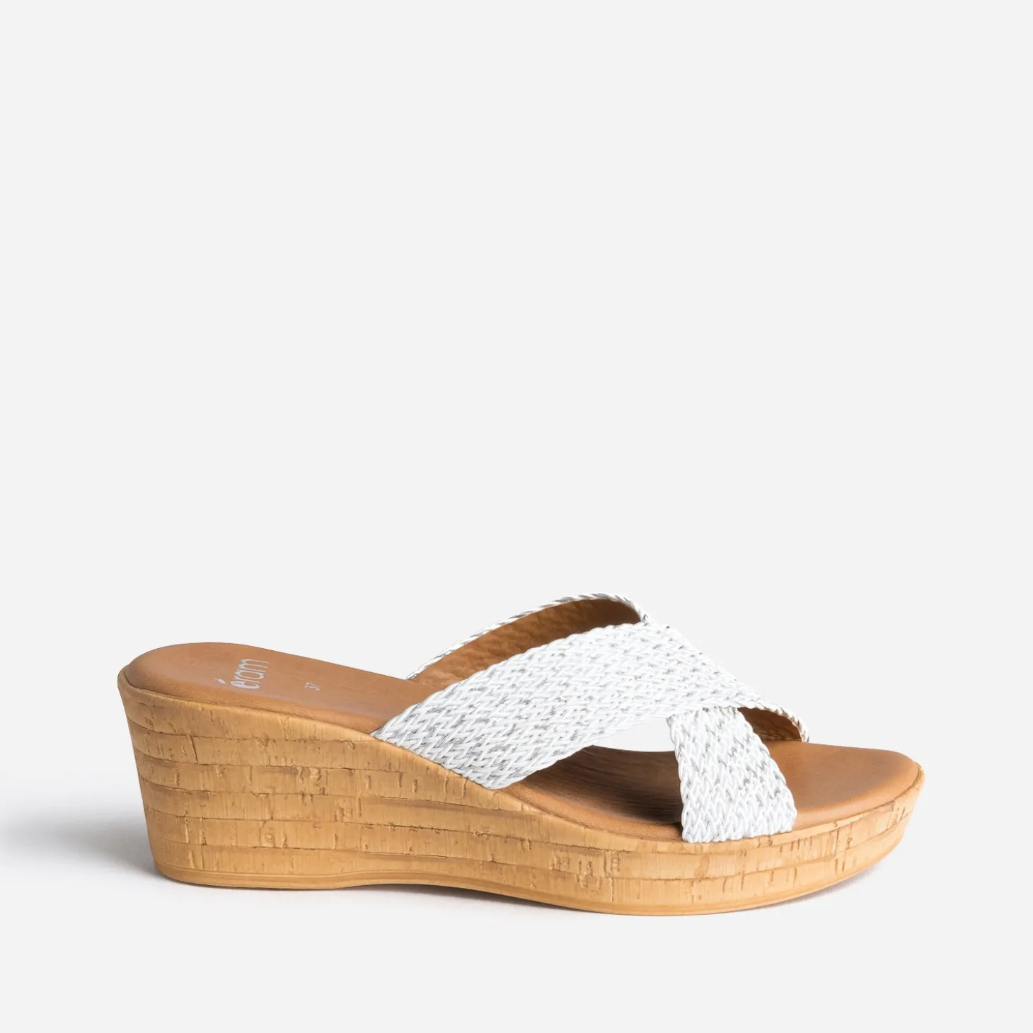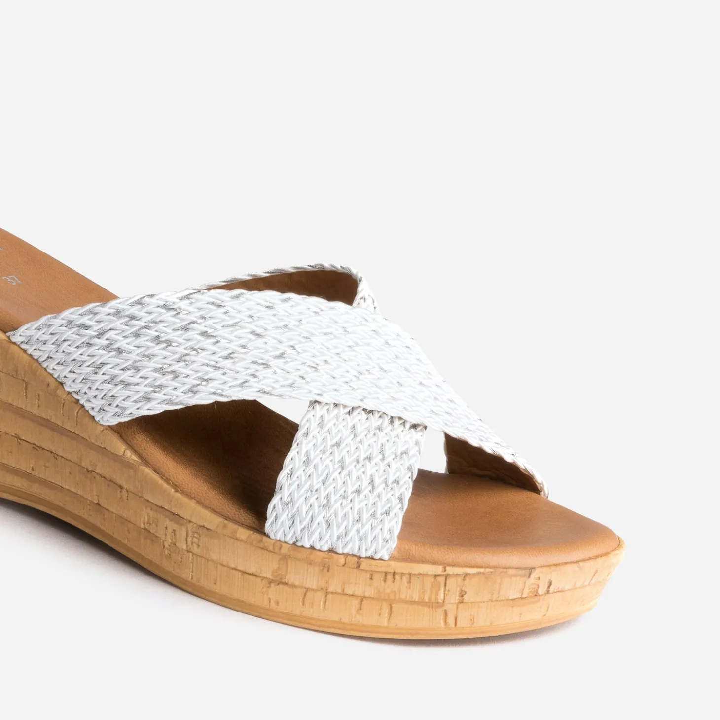 La mule se porte précisément en période estivale. Montée sur un talon compensé imitation liège, elle maintient le pied par deux brides en matières synthétiques tressées, associant le blanc et l’argenté. Un modèle à porter décontracté, avec un tee-shirt blanc et une jupe midi grise et plissée.