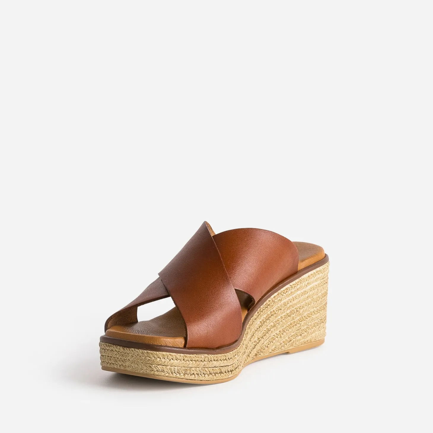 Ne vous fiez pas à son talon massif : cette mule prône la légèreté, pour vous accompagner tout au long de l’été. Montée sur un talon compensé imitation corde, elle s’ajuste au pied par deux larges brides en cuir. Son coloris, un rouge foncé presque brun, s’accorde à la perfection avec les marron.