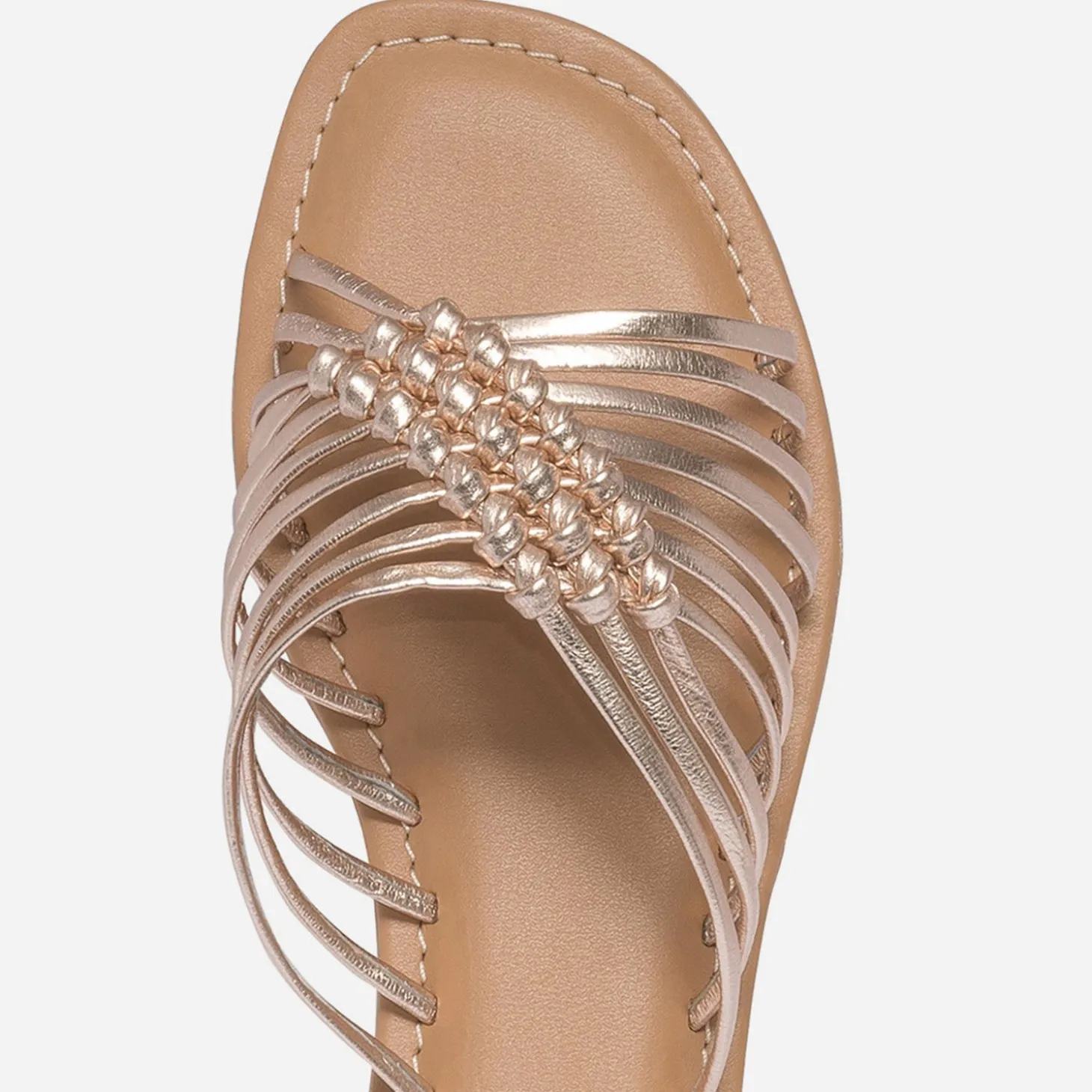 Une simple touche de doré, et c’est toute la tenue qui gagne en chic ! Cette mule pour femme séduit par son cuir souple éco-conçu, qui habille le pied de fines brides au tressage fantaisie, et par son bout carré, plus moderne. Un modèle à porter au quotidien, avec vos robes préférées, longues ou imprimées.