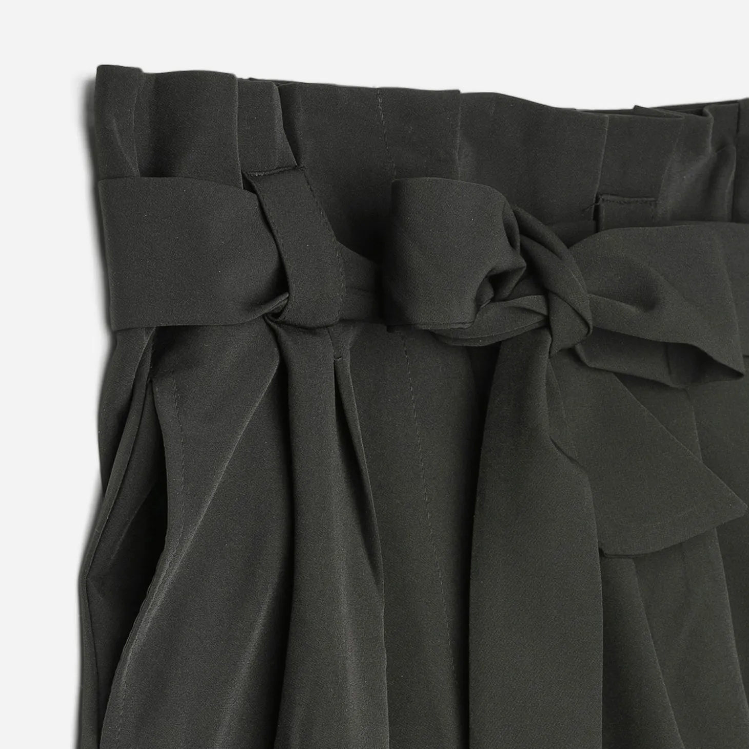 Volume large, longueur cropped, taille haute, 2 poches passepoilées côtés, jeux de plis à la taille, ceinture amovible, fermeture par zip et crochet.