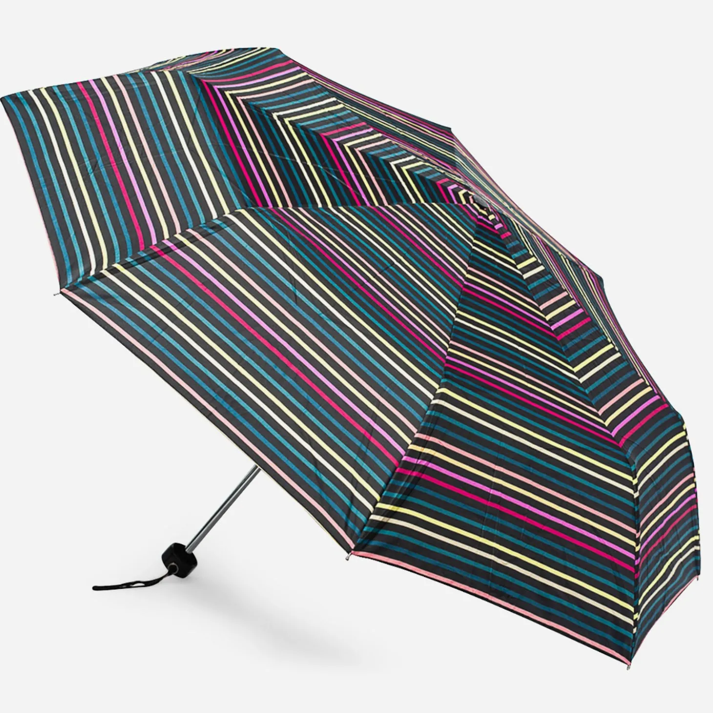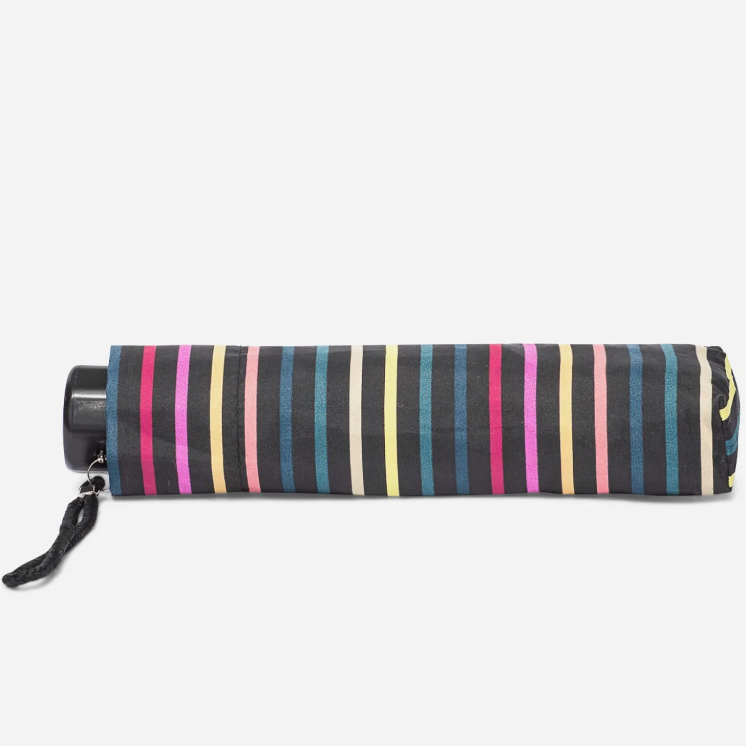 Pour arpenter les rues sans craindre les averses, optez pour ce parapluie noir. Son petit format ultra pratique se glisse dans le sac à main, et ses rayures colorées rappellent les couleurs de l’arc-en-ciel, qu’on guette toujours quand le soleil réapparaît après la pluie.