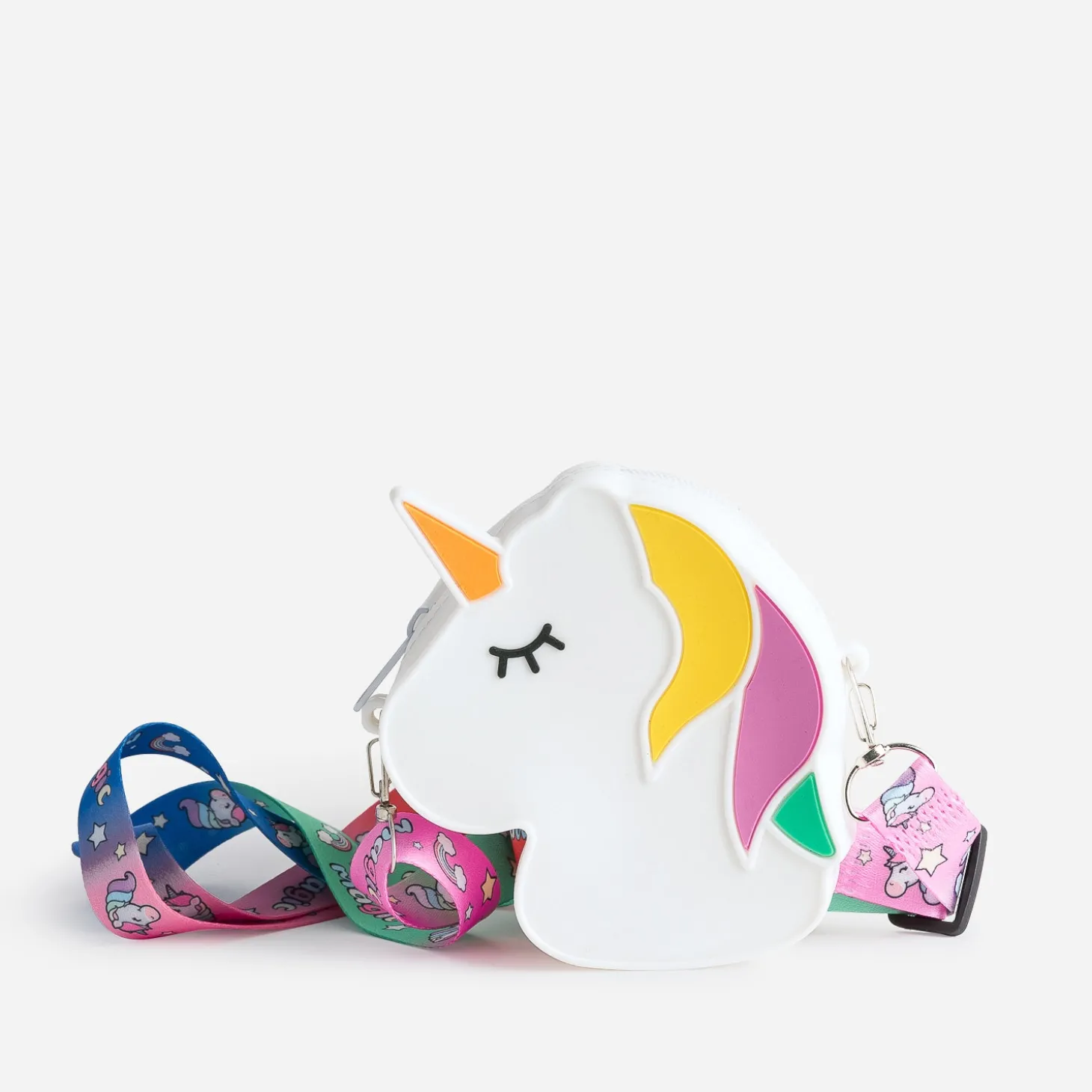 Qui pourrait résister devant cette adorable petite licorne ? En plastique souple de couleur blanche, elle est reconnaissable à sa crinière multicolore et sa découpe corne. Version porte-monnaie ou version sac, grâce à la bandoulière imprimée, réglable et amovible, c’est LE cadeau parfait pour toutes les amoureuses de cet animal… magique !