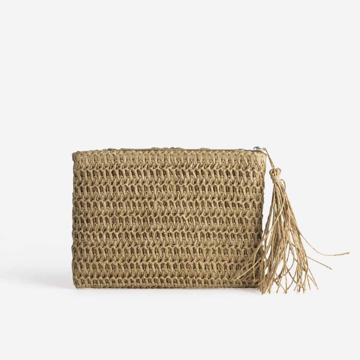Quand l’envie de printemps devient trop fort, compensez-la avec un accessoire bien choisi. Ici, c’est la pochette plate, en paille de papier recyclé et tressé de couleur beige, qui accueille de jolies fleurs, façon pâquerettes ou marguerites. Le zip de fermeture est prolongé d’une longue pampille assortie. Un modèle pour accueillir votre maquillage, vos papiers, ou pour jouer le mini sac, à porter à la main.
