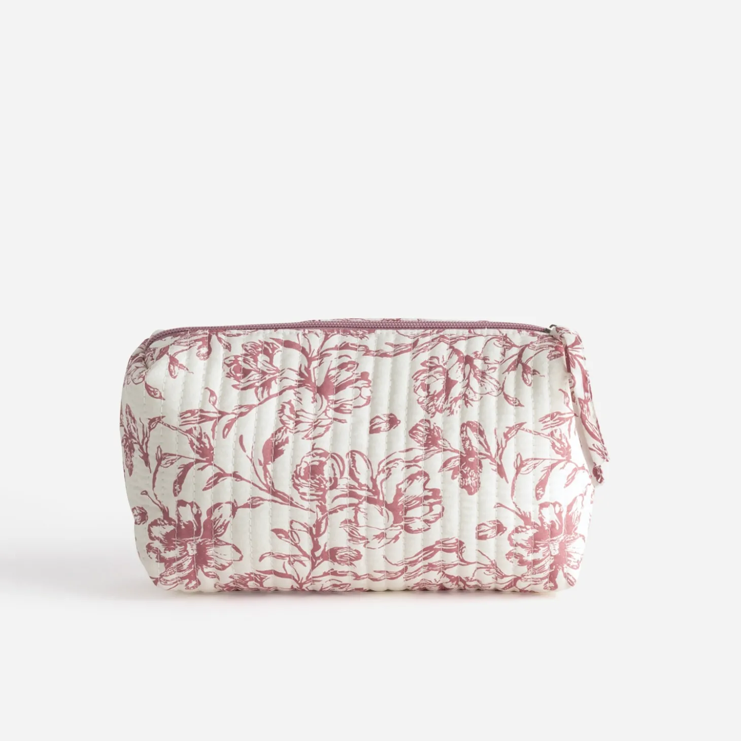 Pour y glisser votre make-up. Pour y ranger vos accessoires pour cheveux. Pour y protéger vos papiers. Cette pochette est faite de promesses. En tissu écru, elle concilie effet matelassé et motif floral rose.
