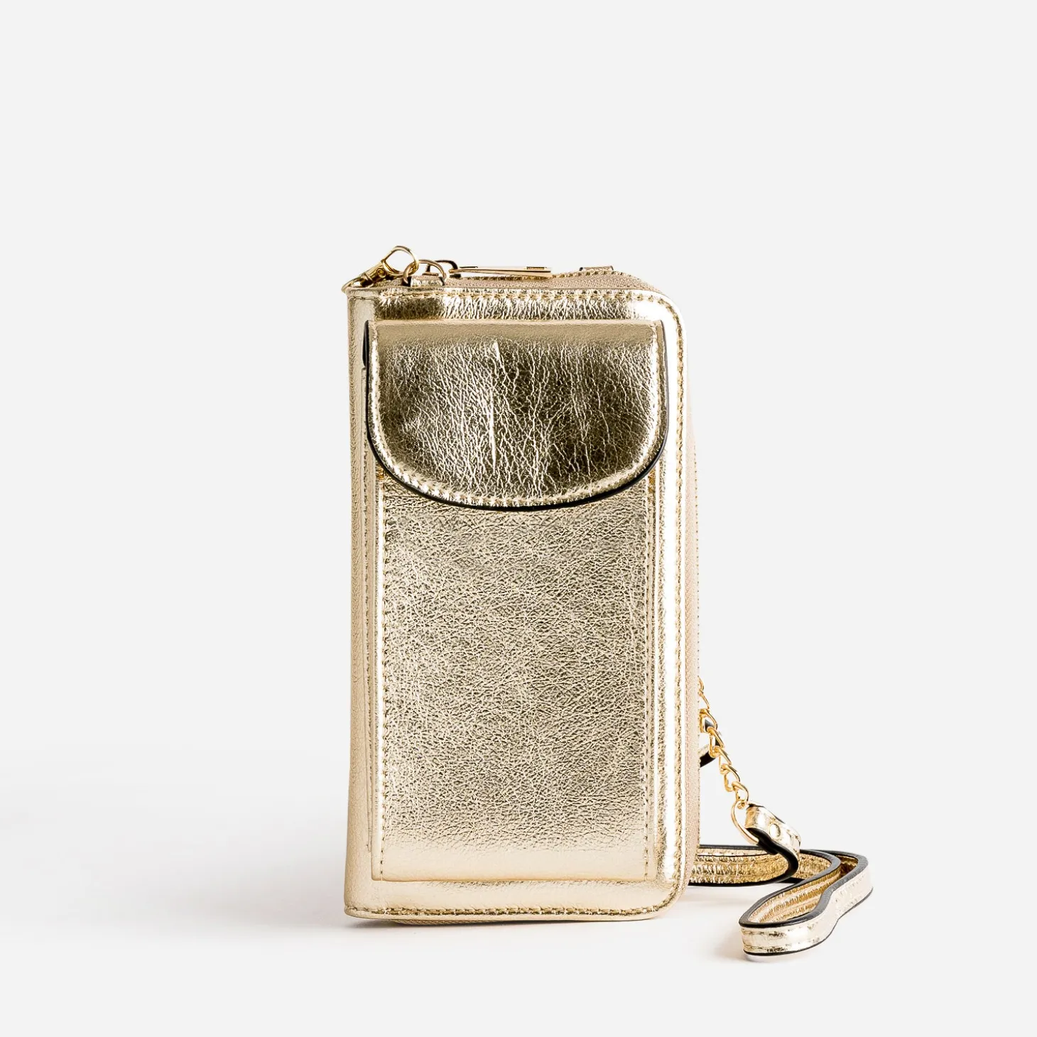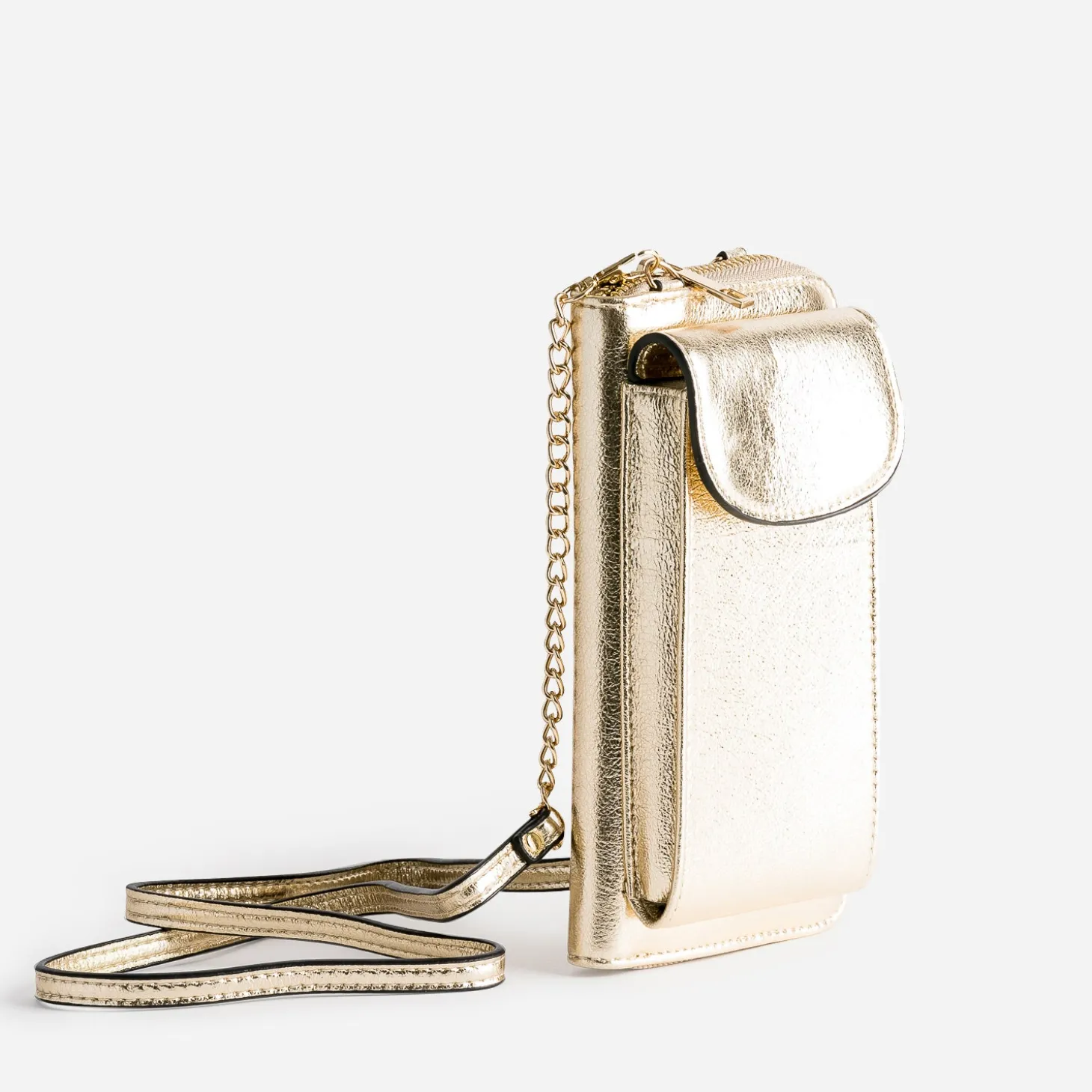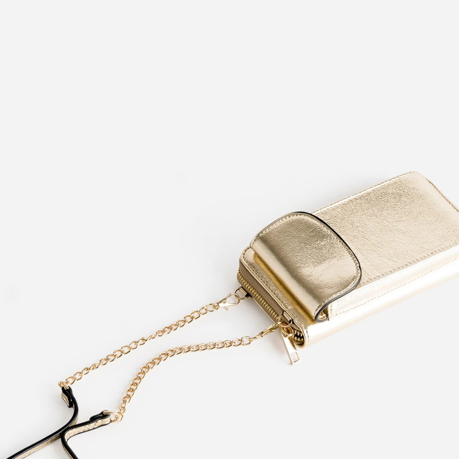 Cartes, billets, monnaie, papiers, dans la partie portefeuille. Téléphone portable, dans la poche externe avec rabat aimanté. Voilà un accessoire qui compile les deux, pour garder vos essentiels à portée de main, grâce à sa bandoulière-chaînette dorée réglable et amovible. Confectionné en matière synthétique dorée, il s’autorise une finition métallisée, pour twister les looks d’une touche fun et décalée.
