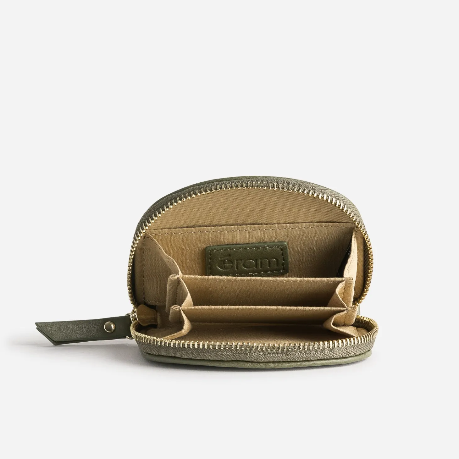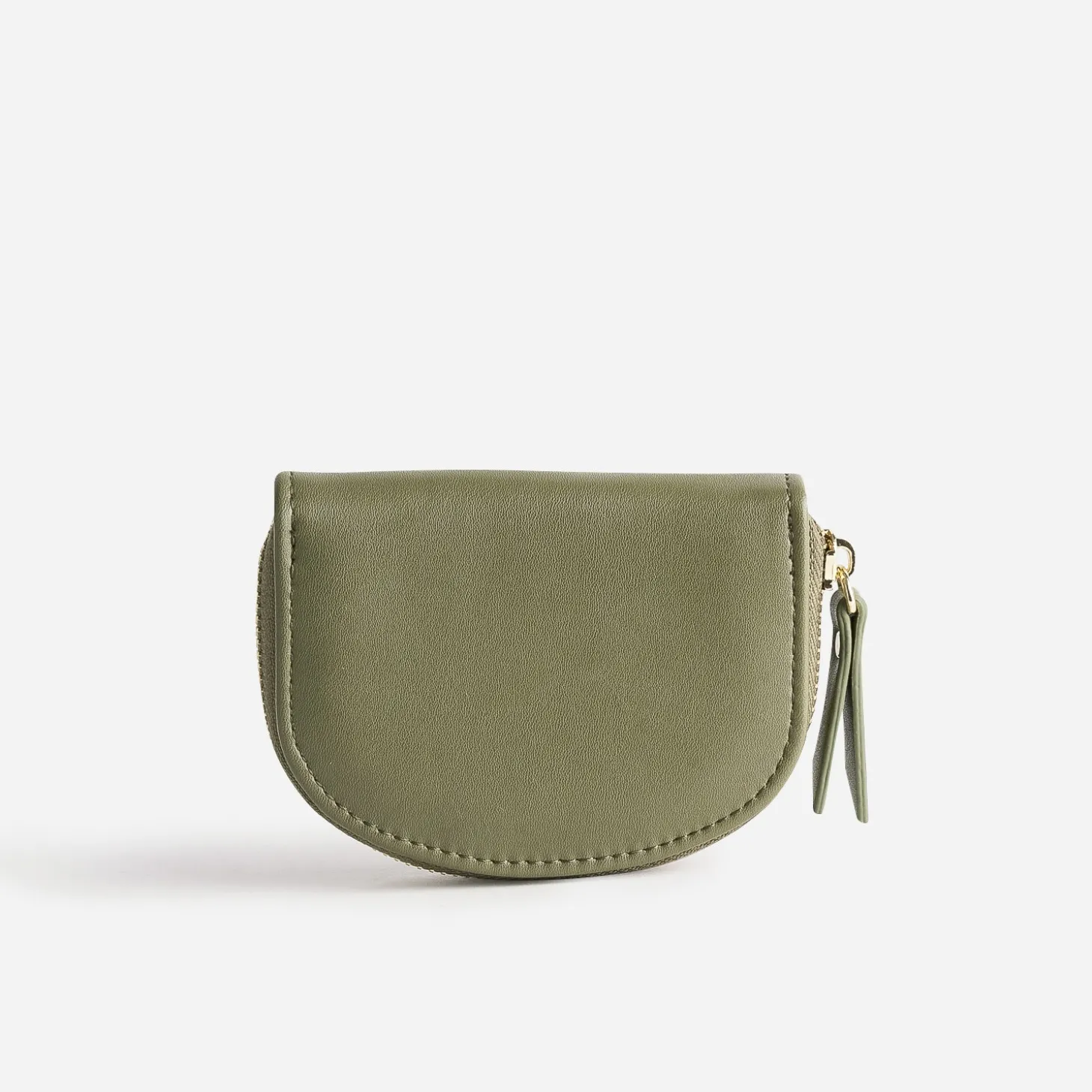 Reprenez contact ! Le porte-monnaie est votre meilleur allié, pour ranger billets et pièces de monnaie. En matière synthétique kaki, il adopte une forme arrondie et se ferme par un zip doré.