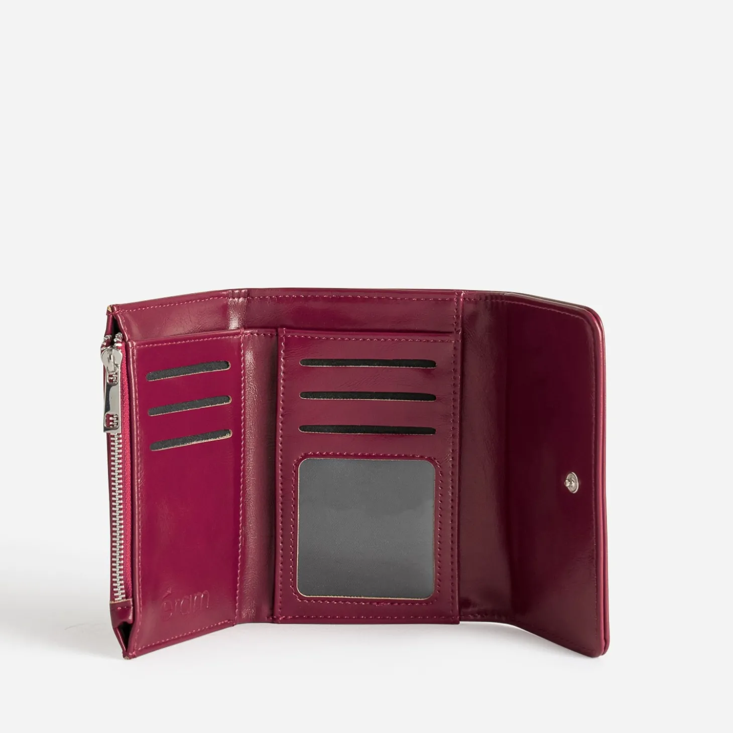 Ouverture en triptyque pour ce portefeuille rouge foncé. En matière synthétique lisse, il présente une finition glacée. Il s’ouvre sur 6 fentes pour cartes, 1 comportement à billets, 2 ouvertures intérieures et, sur le côté, 1 poche zippée pour la monnaie. Il se ferme par une pression cachée sous le rabat. Un accessoire de petite maroquinerie, à glisser dans son sac à main, pour avoir tous vos papiers personnels à portée de main.