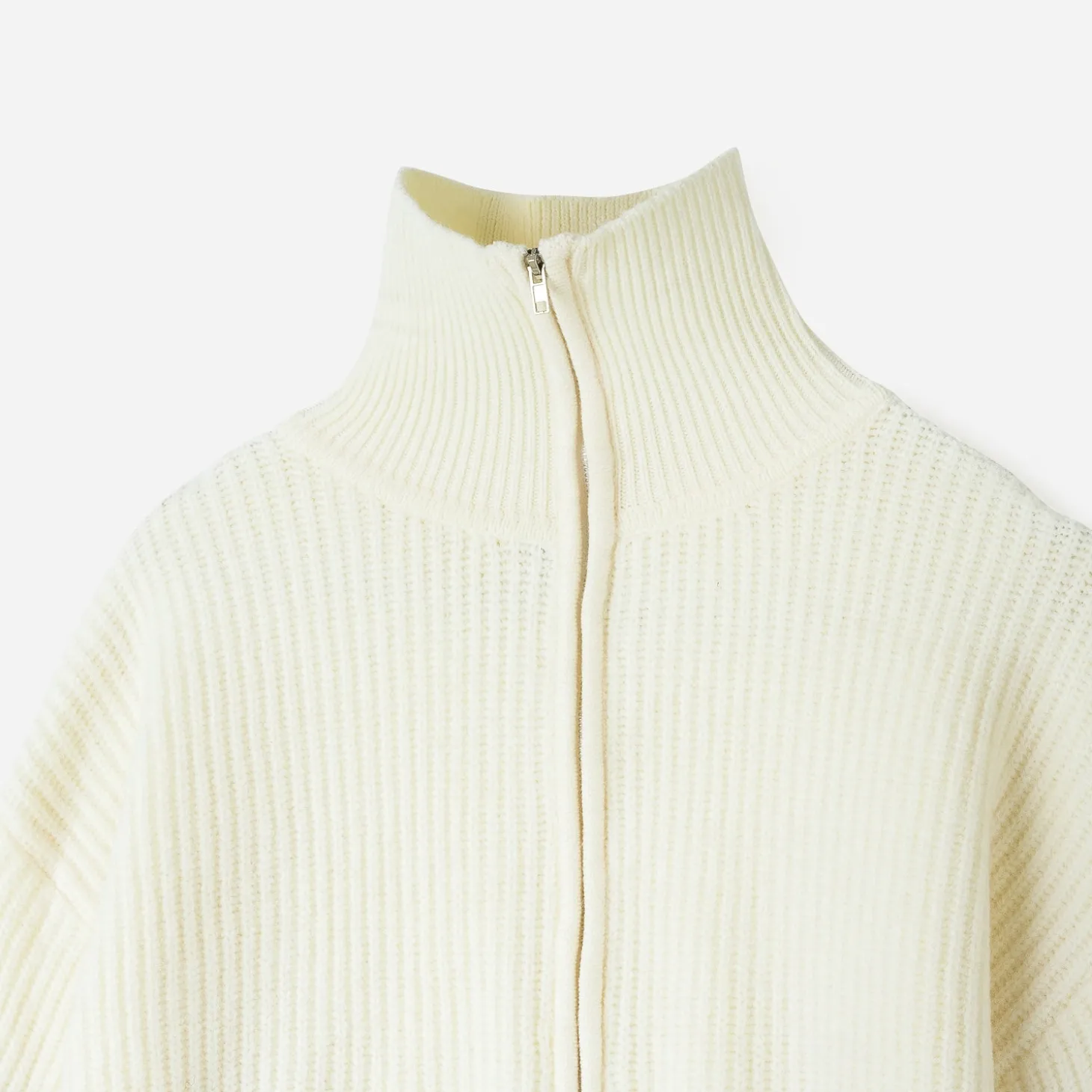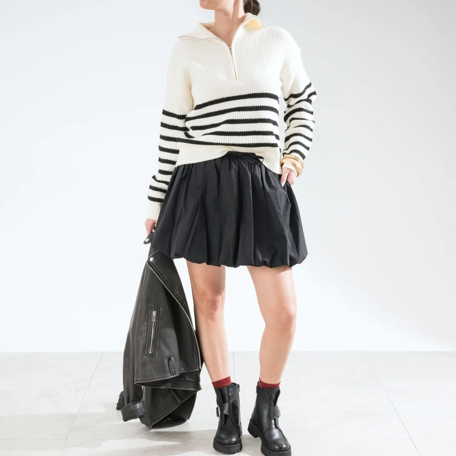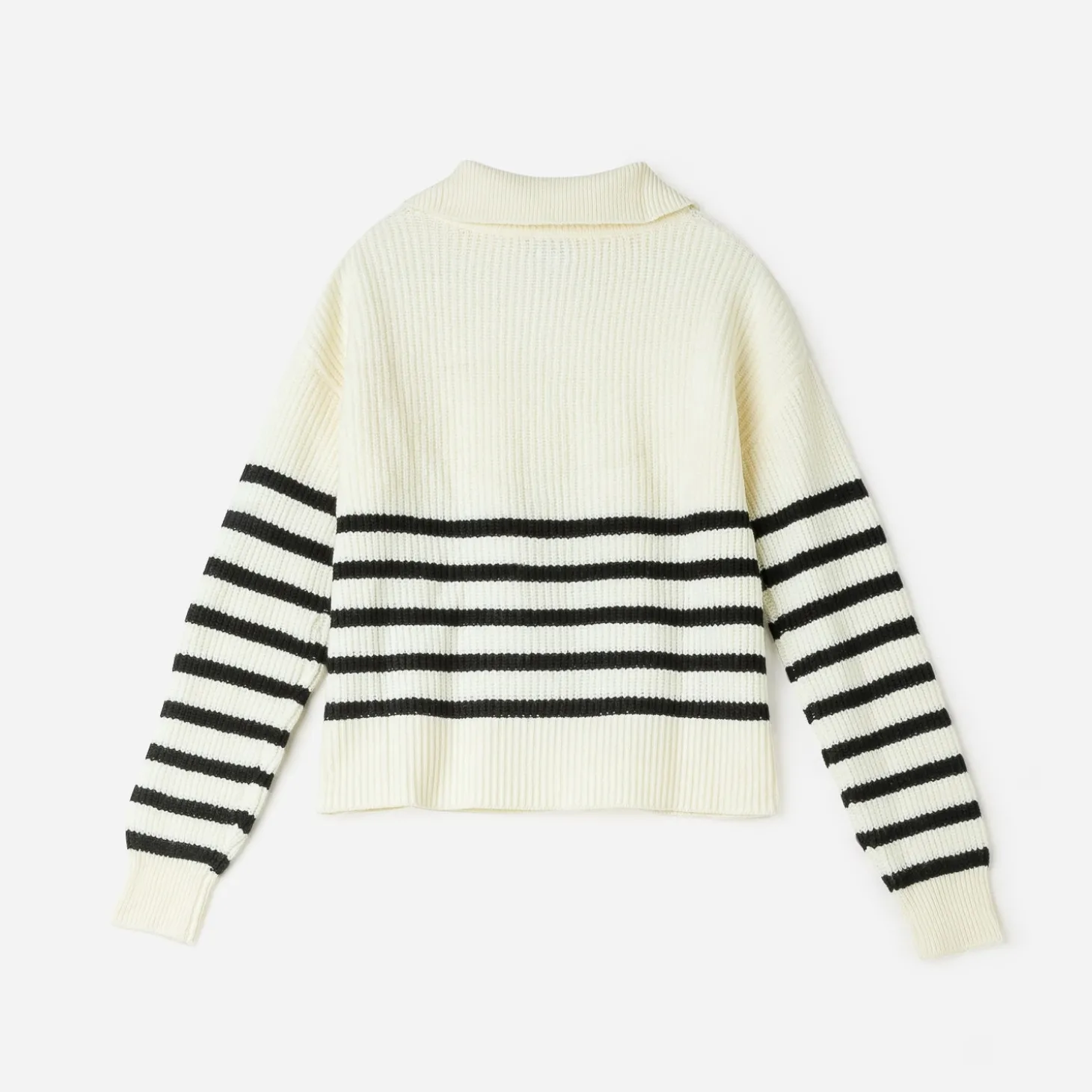 Coupe oversize, col camionneur, manches longues, motif rayures esprit marinière, bords-côtes au col, manches et buste, fermeture par zip au col.
