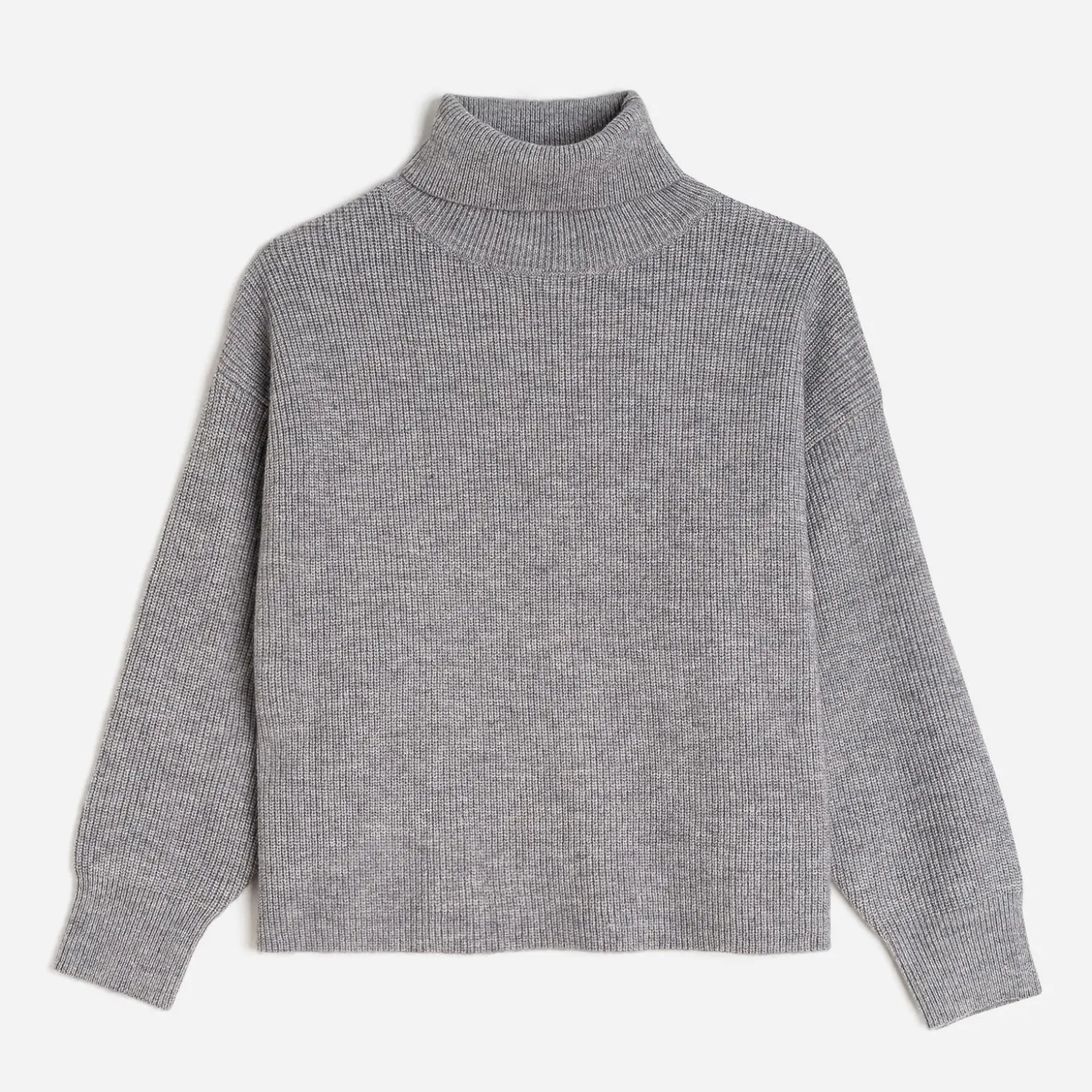 Le plaisir de l’hiver, c’est de se glisser dans un pull oversize. En tricot gris, il associe col roulé et emmanchures descendues, pour un style décontracté.