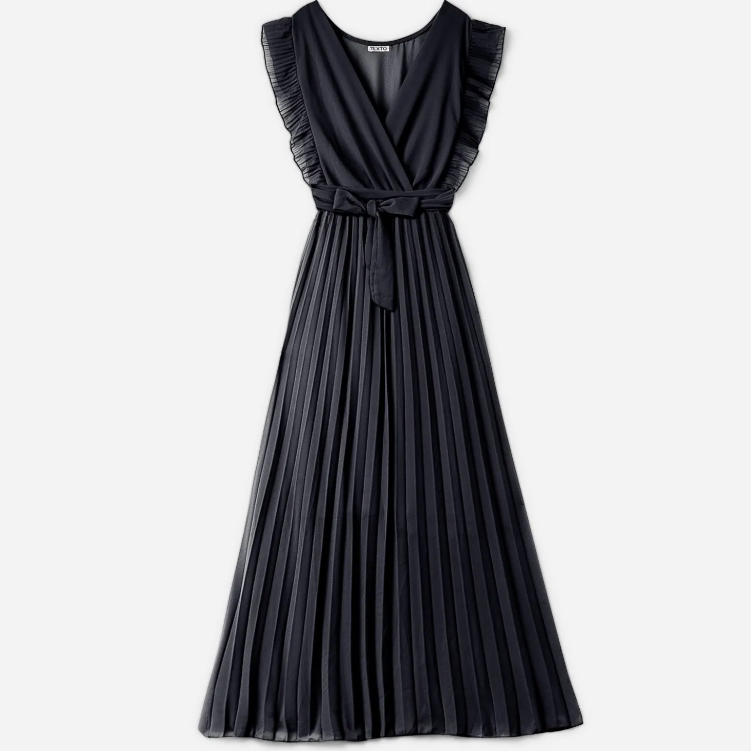 Coupe évasée, encolure en V, sans manches, détails volants devant et dos, taille élastiquée, passants à la taille, ceinture assortie amovible, doublure unie, longueur : 138 cm.